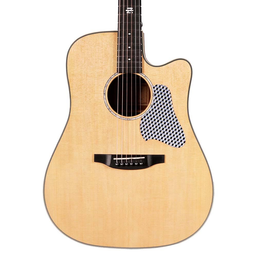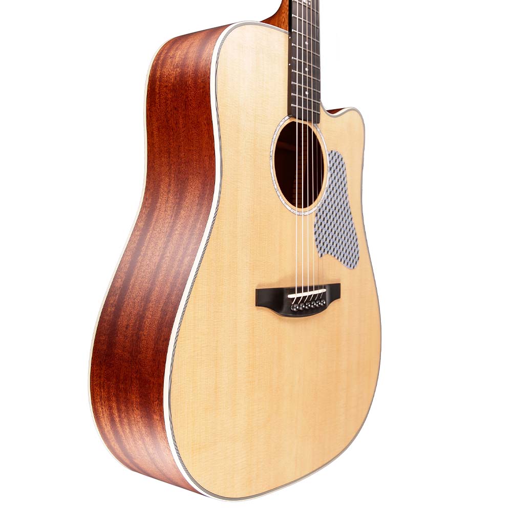 Верхняя дека из массива ели формирует яркое, чистое и хорошо читаемое звучание с отличной динамикой. Нижняя дека и обечайка из сапеле добавляют теплоту и глубину, делая тон сбалансированным и музыкальным. Такое сочетание материалов раскрывает характер инструмента и позволяет ему звучать объемно и естественно.