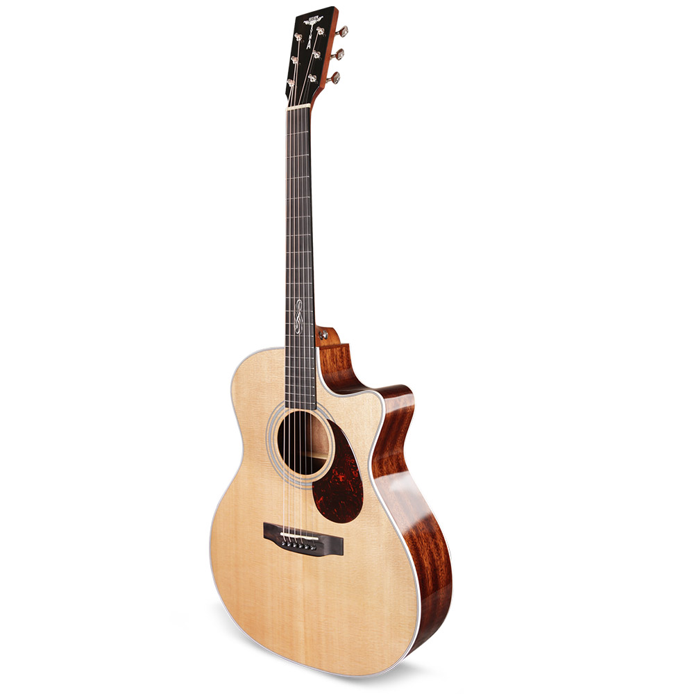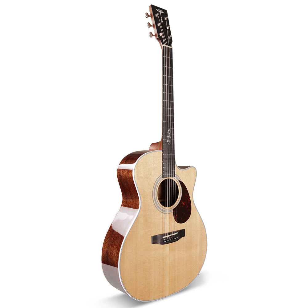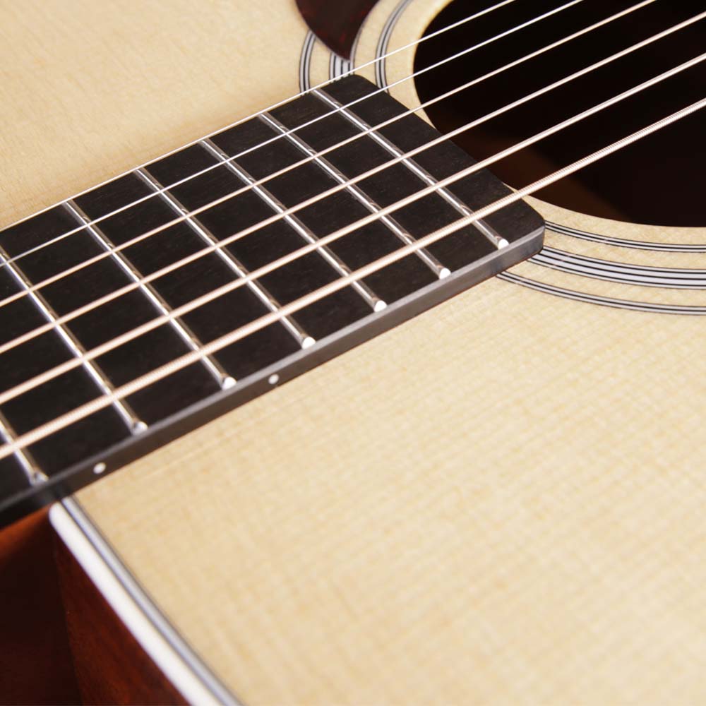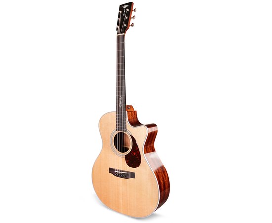 Верхняя дека из массива ситхинской ели формирует яркое, чистое и хорошо читаемое звучание с отличной динамикой. Нижняя дека и обечайка из массива красного дерева добавляют теплоту и глубину, делая тон сбалансированным и музыкальным. Такое сочетание материалов раскрывает характер инструмента и позволяет ему звучать объемно и естественно.