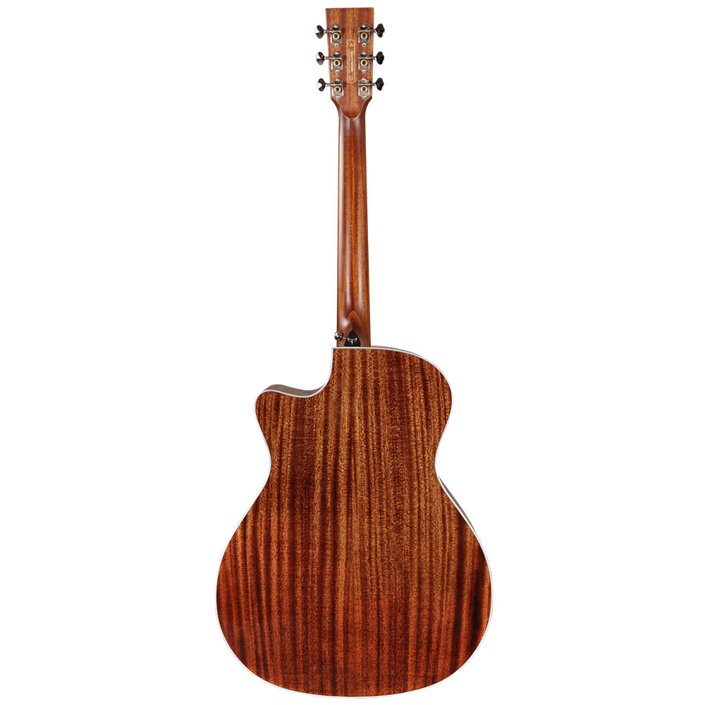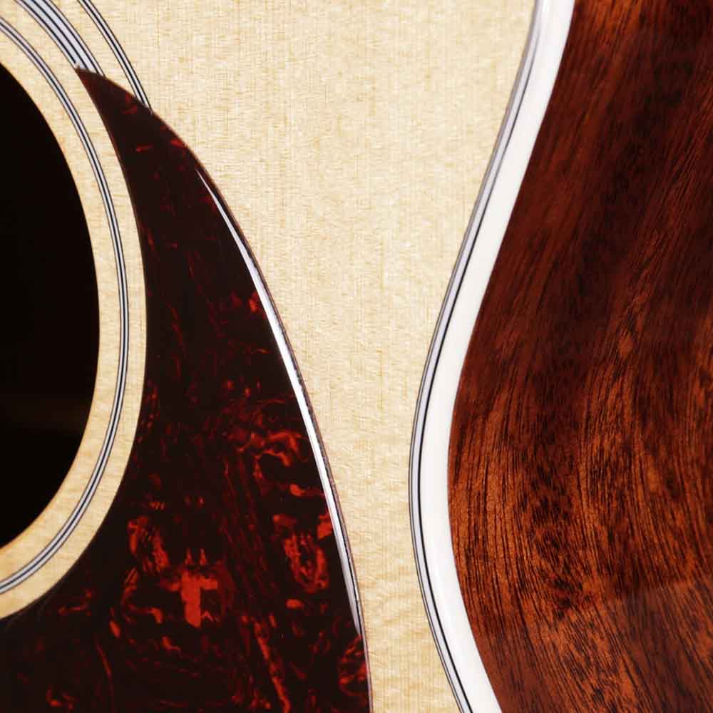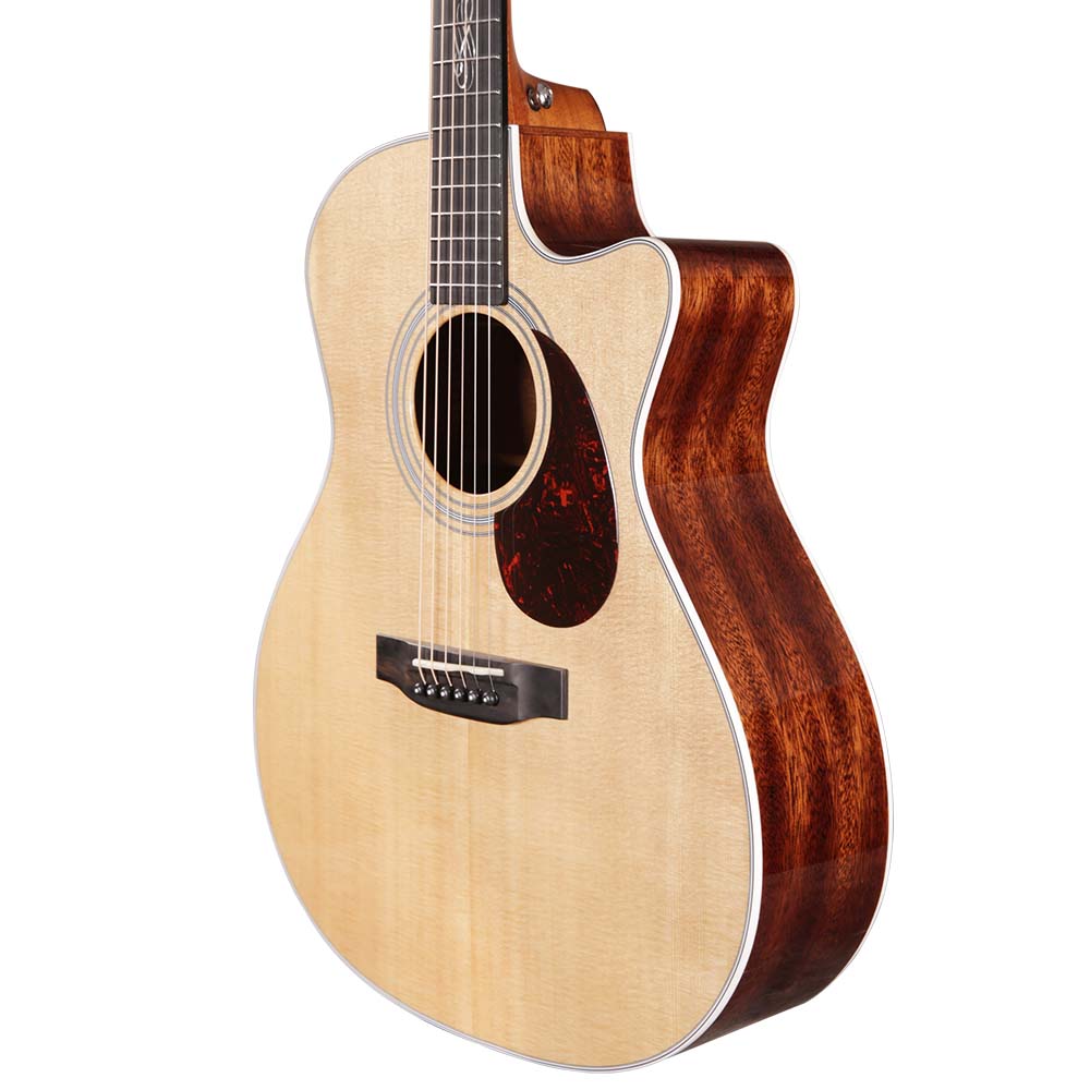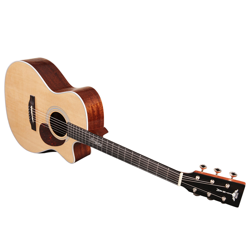 Верхняя дека из массива ситхинской ели формирует яркое, чистое и хорошо читаемое звучание с отличной динамикой. Нижняя дека и обечайка из массива красного дерева добавляют теплоту и глубину, делая тон сбалансированным и музыкальным. Такое сочетание материалов раскрывает характер инструмента и позволяет ему звучать объемно и естественно.