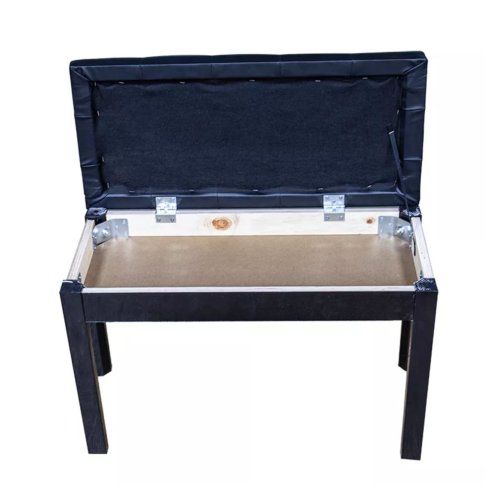 Банкетка для пианино из твердой древесины, материал сидушки: кожзам, прошитый по методу каретной стяжки; размер сиденья 74 x 35 см, высота 50 см, наличие отделения для нот под сидушкой, черный цвет.