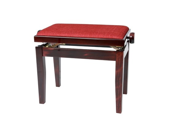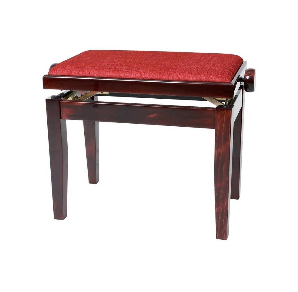Банкетка для пианино из твердой древесины, ножки закреплены на подставке с винтовым дюбелем с высоким растяжением M10, способна выдерживать более 200 кг, велюровое покрытие седушки (седушка 52 х 30 см), точное механизм обеспечивает плавную и точную регулировку высоты (45-58 см), производитель - Германия, цвет - глянцевое красно дерево.