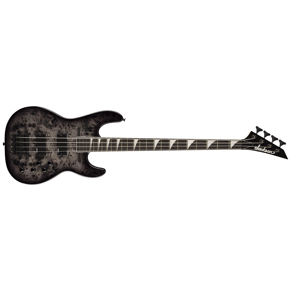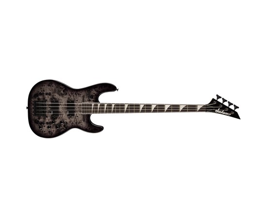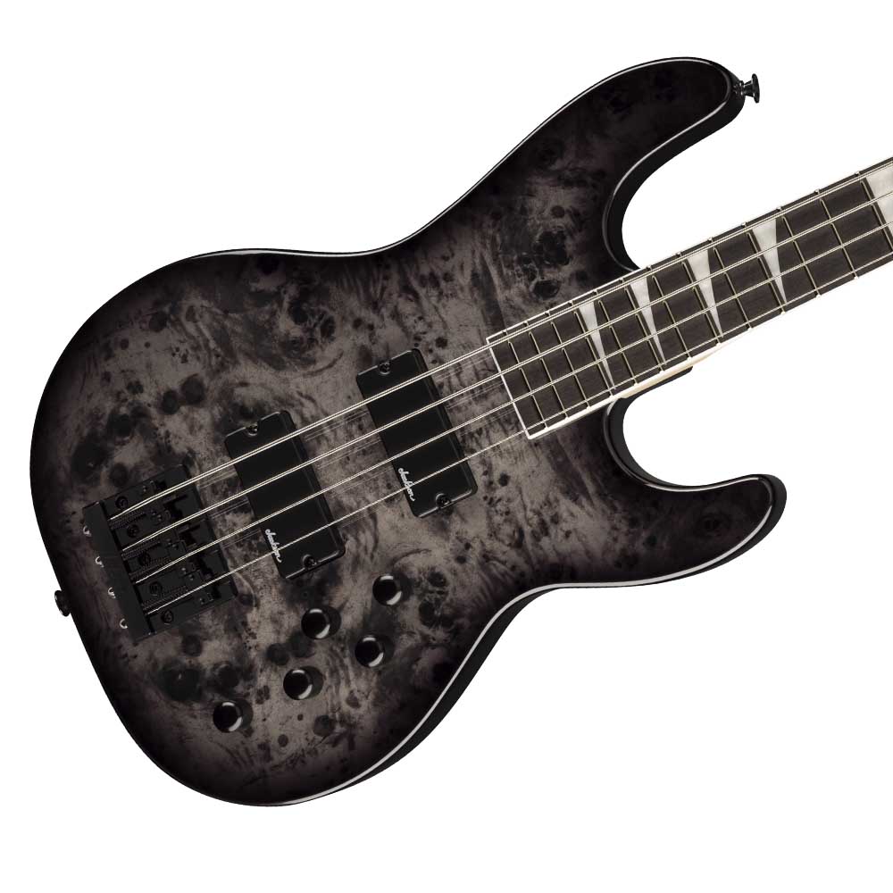4-х струнная бас гитара, форма Concert™ Bass, корпус из тополя с глянцевым покрытием, гриф из клёна с креплением на 4-х болтах, накладка на гриф из амаранта с составным радиусом 12–16 дюймов с 24 ладами, два мощных звукоснимателя Jackson® Covered High-Output Humbucking, активный 3-полосный эквалайзер, бридж Jackson® HiMass™, герметичные литые колки Jackson® Sealed Die-Cast, цвет Transparent Black.