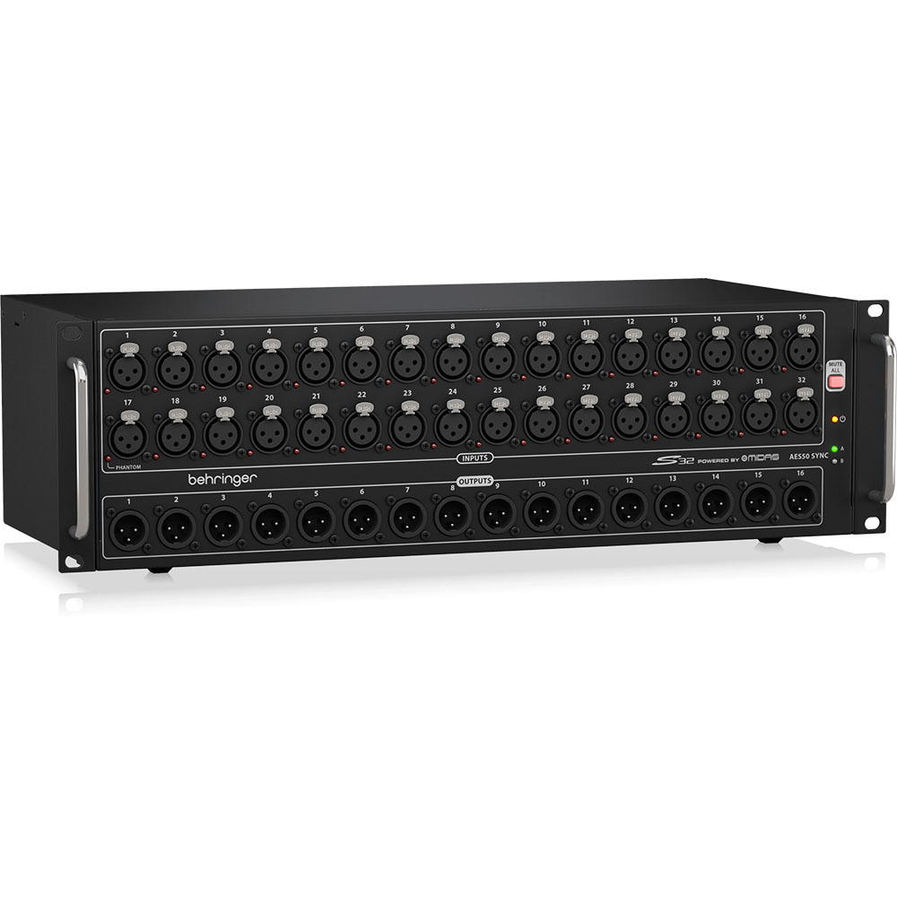 S32 предлагает 32 полностью программируемых микрофонных предусилителя Midas, 16 балансных XLR-выходов, автоматическое разделение сцен AES50, каскадирование дополнительных блоков без маршрутизатора, два выхода ADAT, два порта AES-3, Mute All для мгновенного отключения всех входов, дистанционное управление на кабеле CAT5e до 100 м, USB для обновлений системы и MIDI для связи с консолью и сценическими устройствами.