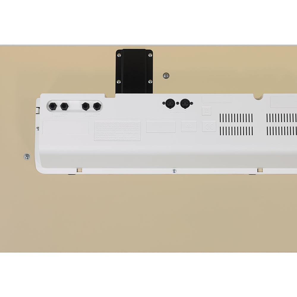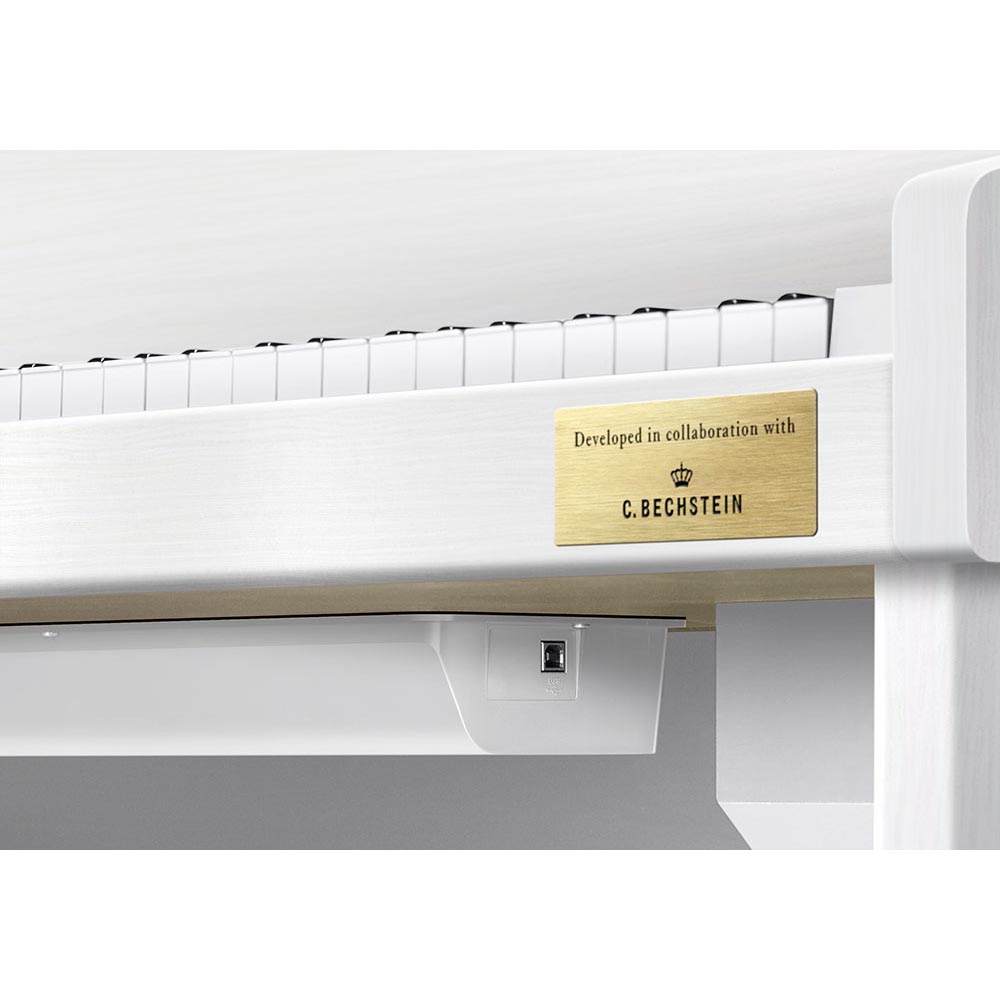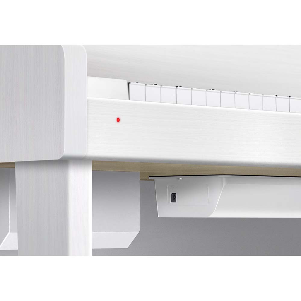 Современный корпус в элегантном белом цвете снабжен стерео системой с двумя динамиками, имеет встроенный пюпитр и выдвигающуюся крышку клавиатуры.