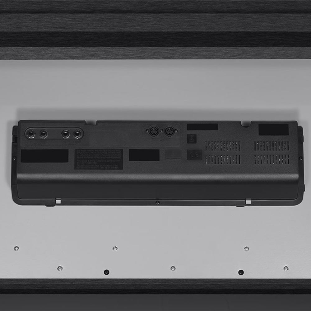 Современный корпус в элегантном черном цвете снабжен стерео системой с двумя динамиками, имеет встроенный пюпитр и выдвигающуюся крышку клавиатуры.