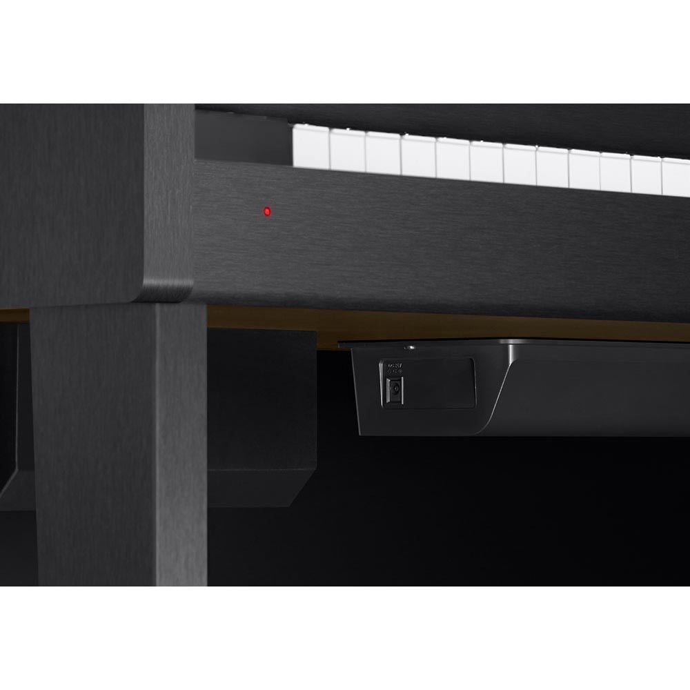 Современный корпус в элегантном черном цвете снабжен стерео системой с двумя динамиками, имеет встроенный пюпитр и выдвигающуюся крышку клавиатуры.
