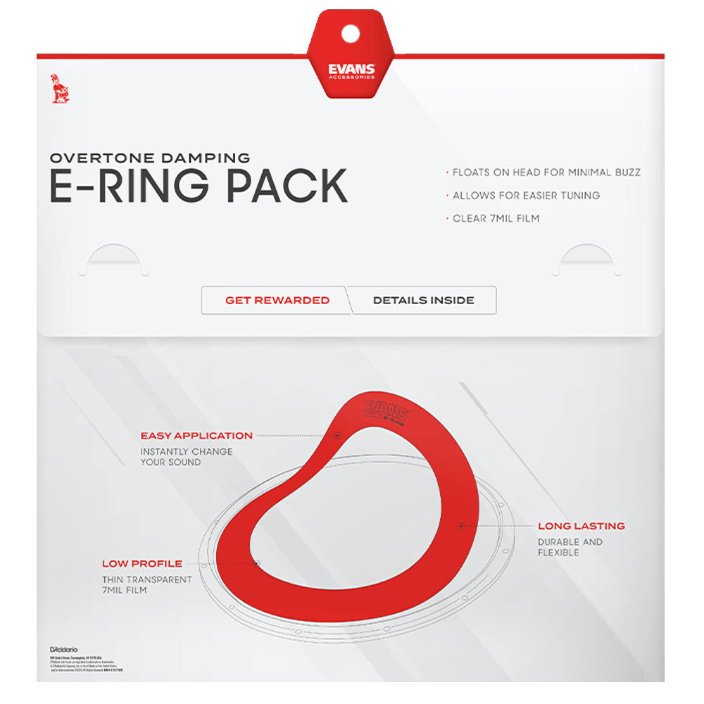 EVANS E-Ring — это простое в использовании внешнее кольцо управления обертонами для барабанов, которое плавает на поверхности пластика, удаляя обертоны и выравнивая звук пластика, что упрощает настройку.