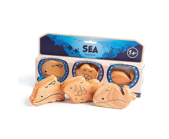 Детский перкуссионный набор, погремушки в виде животных (дельфин, рыба-клоун и кит), деревянные, сделаны в Индии.