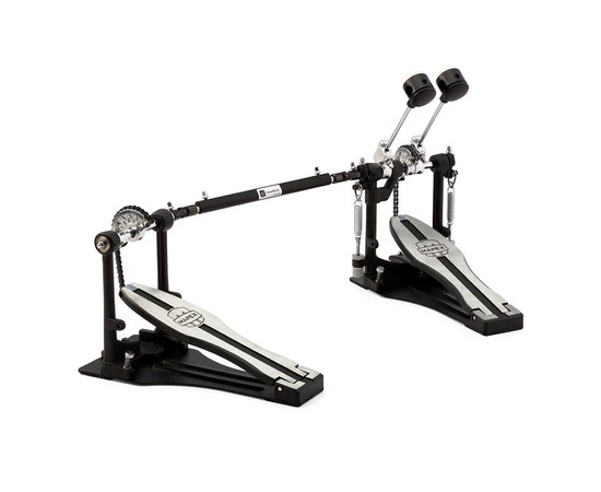 Двойная педаль для бас-барабана, одинарный цепной привод, двухпозиционные колотушки из АБС-пластика, платформа с нескользящим покрытием.