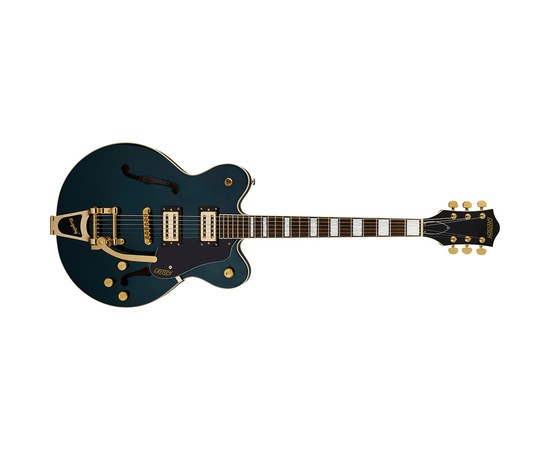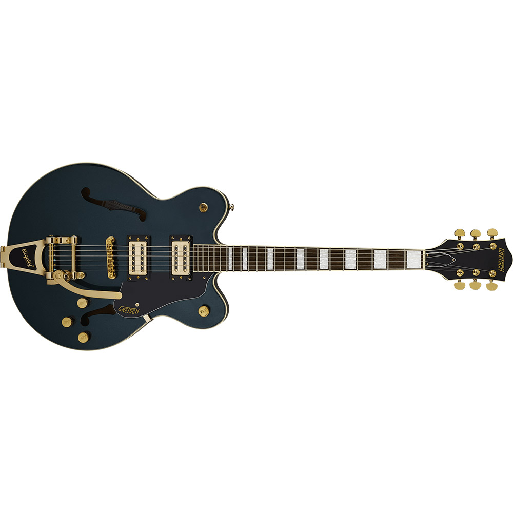 Электроакустическая гитара лимитированной серии Streamliner™ Collection, полый корпус из ламинированного клёна с центральным блоком, два звукоснимателя-хамбакера Broad'Tron BT-3S с 3-позиционным переключателем, гриф из нато формы "C", накладка грифа из лавра радиусом 12 дюймов с инкрустацией Big Block и 22 ладами Medium Jumbo, верхний порожек из кости, регуляторы Master Volume, Master Tone и отдельной громкости звукоснимателей; функция Push/Pull для разделения катушек, закреплённый бридж Adjusto-Matic для точной интонации с тремоло, трёхслойный чёрный пикгард, позолоченная фурнитура, изысканный цвет "Полуночный сапфир".