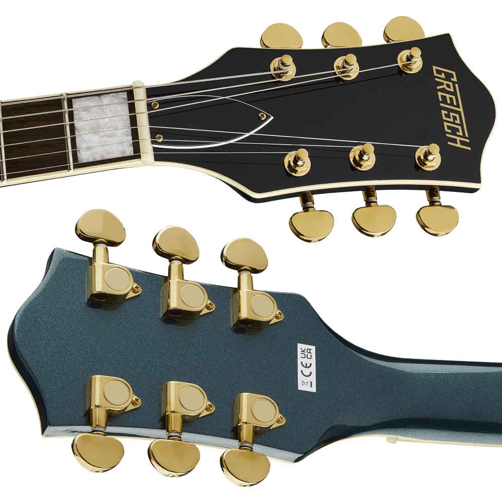 Гитара впечатляет внешним видом: золотая фурнитура, металлические ручки управления G-Arrow, трёхслойный чёрный пикгард и изысканная перламутровая инкрустация Big Block придают инструменту королевский облик. Гриф из нато формы “C” с накладкой из лаврового дерева радиусом 12 дюймов и 22 ладами Medium Jumbo обеспечивает комфорт и точность игры, а верхний порожек из натуральной кости усиливает резонанс и стабильность звучания.