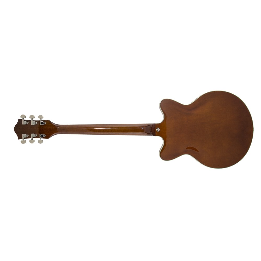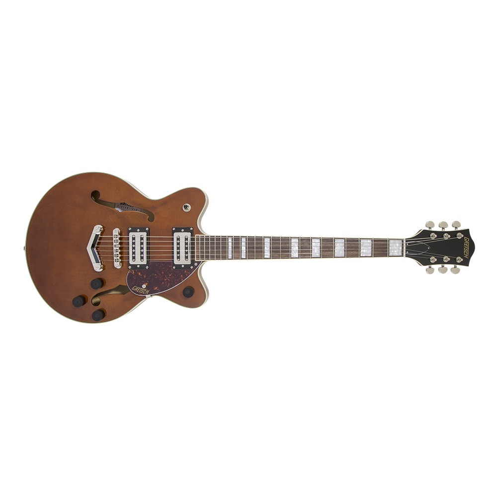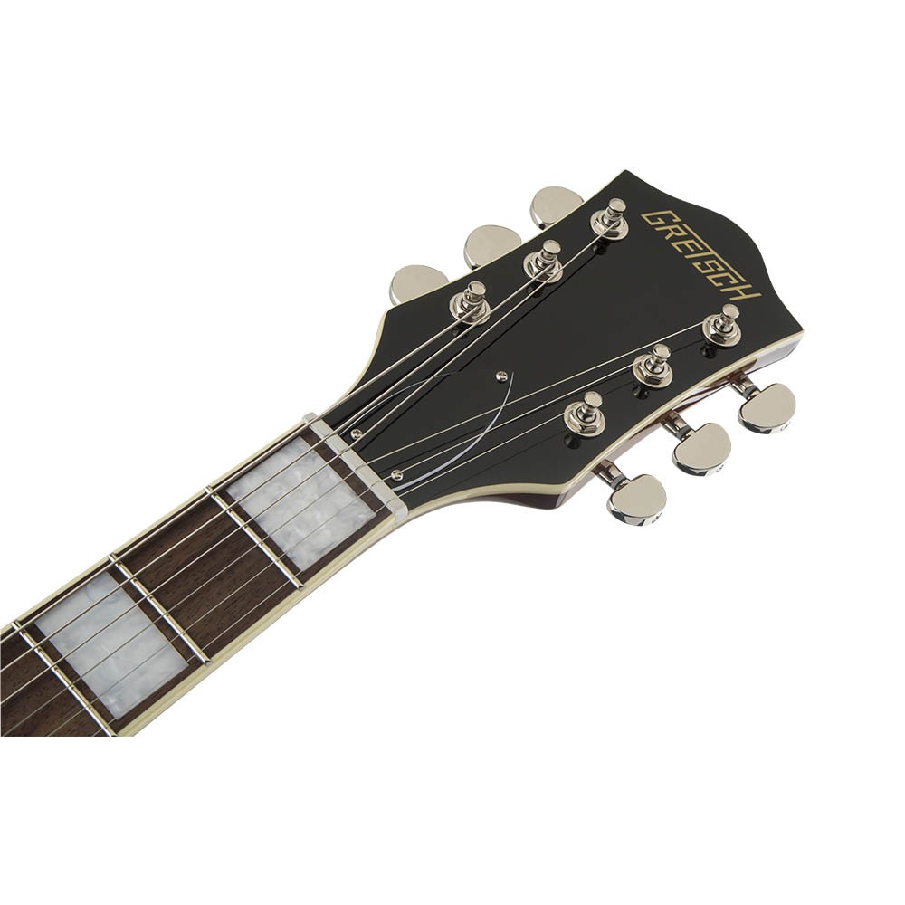 Корпус гитары формы Streamliner Center Block с двумя вырезами выполнен из ламинированного клена. Удобный для быстрой игры гриф профиля Thin "U" изготовлен из древесины нато, с глянцевой отделкой и белой окантовкой. Накладка на гриф из лавра радиусом 12 дюймов (305 мм). Фиксированный бридж Adjusto-matic™ обеспечивает надежность строя, а тремоло Bigsby B70 предоставляет широкие возможности для экспрессивной игры. Инструмент элегантно выглядит в изящном полом корпусе с винтажными золотыми регуляторами, двухслойной черно-белой окантовкой корпуса, обтекаемой никелированной фурнитурой и черным пикгардом с логотипом Gretsch.