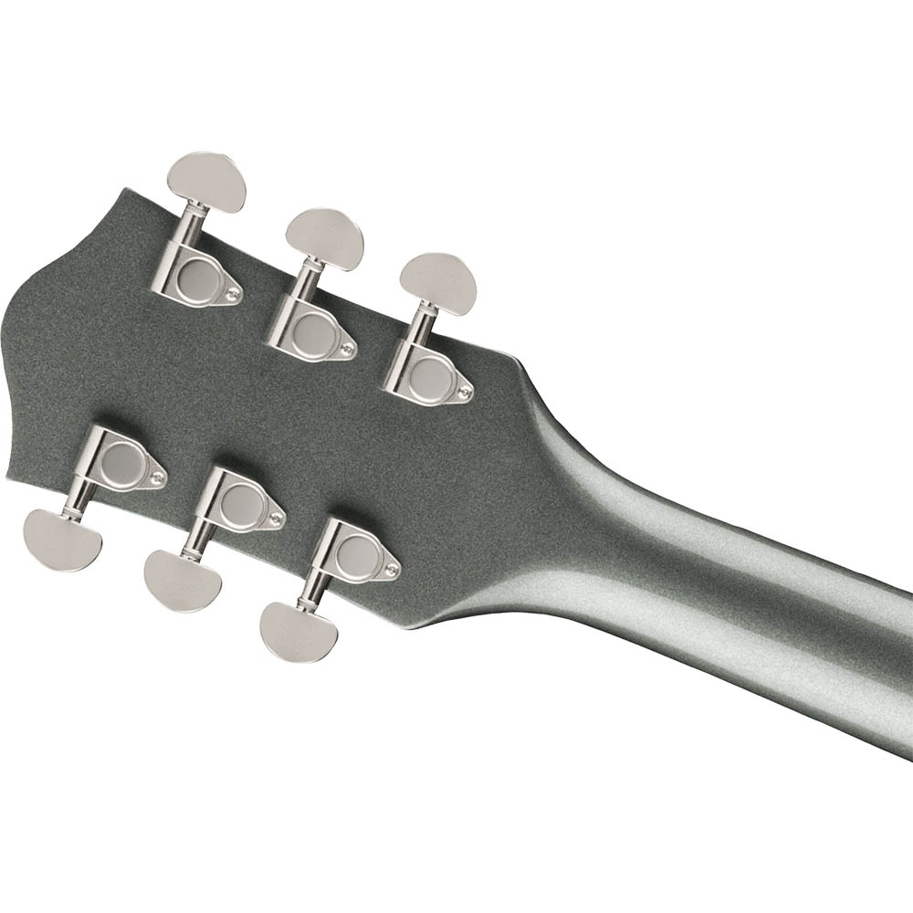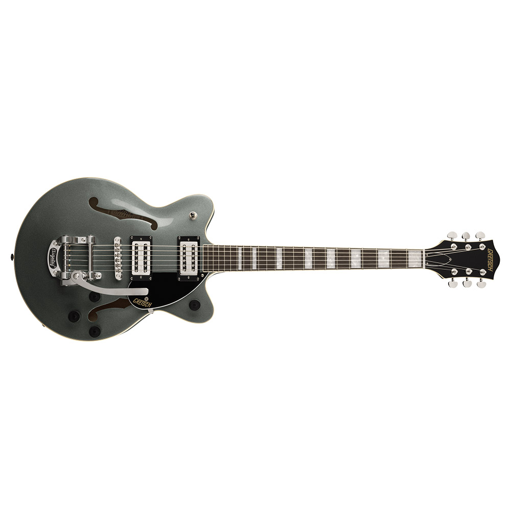 Корпус гитары формы Streamliner Center Block с двумя вырезами выполнен из ламинированного клена. Удобный для быстрой игры гриф профиля Thin "U" изготовлен из древесины нато, с глянцевой отделкой и кремовой окантовкой. Накладка на гриф из индийского лавра радиусом 12 дюймов (305 мм). Фиксированный бридж Adjusto-matic™ обеспечивает надежность строя, а тремоло Bigsby B50 предоставляет широкие возможности для экспрессивной игры. Инструмент элегантно выглядит в изящном полом корпусе с винтажными черными регуляторами, двухслойной окантовкой корпуса, обтекаемой никелированной фурнитурой и черным пикгардом с логотипом Gretsch.