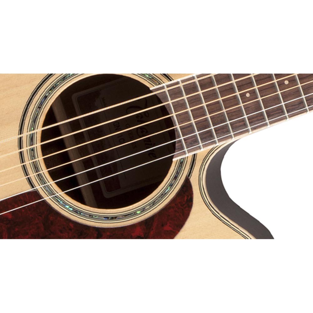 Электроакустическая гитара, корпус NEX с вырезом, верхняя дека из массива ели, нижняя дека и обечайка из черного ореха, тонкий гриф из красного дерева с накладкой из лавра с радиусом 12", встроенная электроника Takamine TK-40D с тюнером, трехполосным эквалайзером и расширенными настройками звучания; верхний порожек из синтетической кости, раздельный нижний порожек на бридже, кленовая окантовка, розетка из абалона, позолоченные литые колки с янтарными кнопками, глянцевая отделка, натуральный цвет.