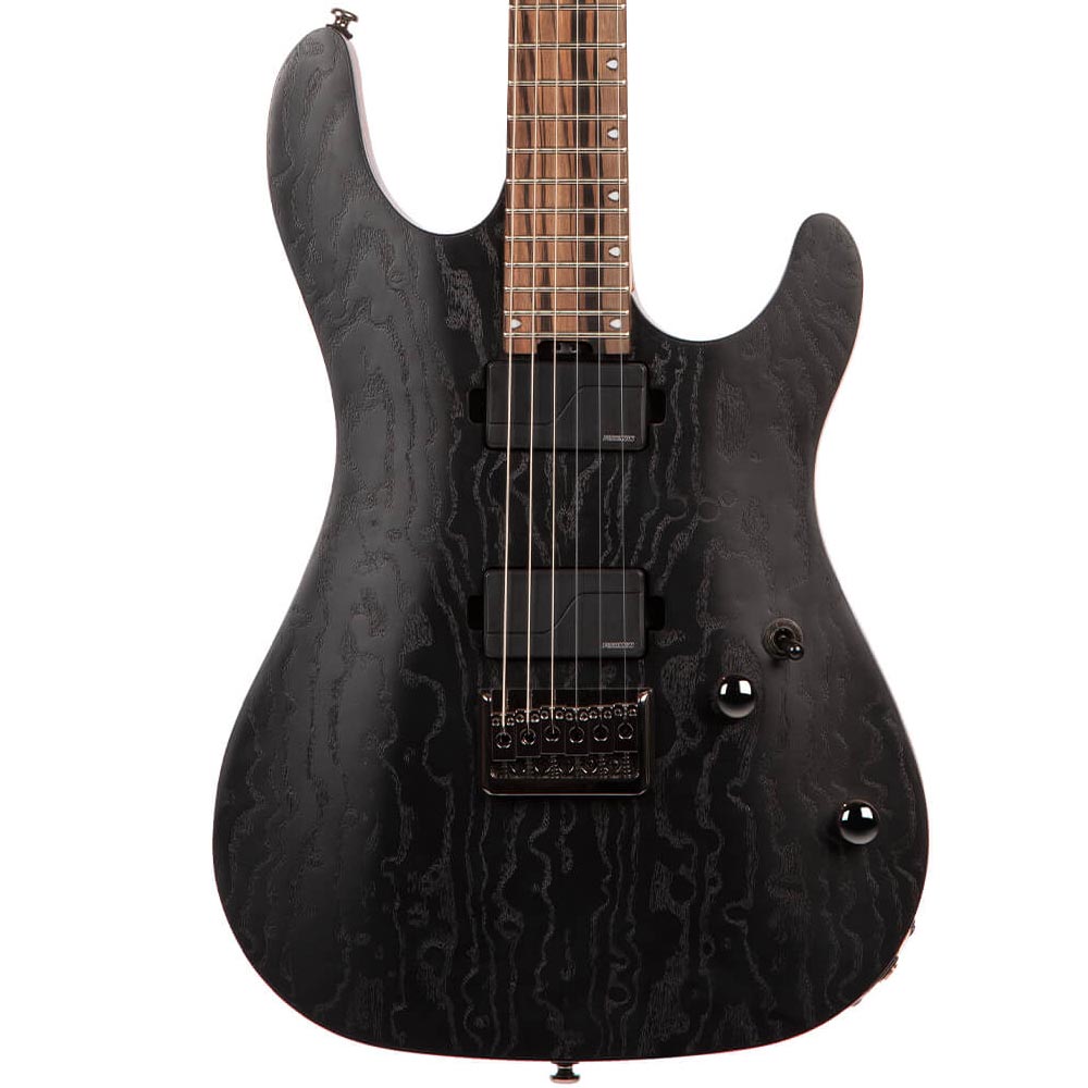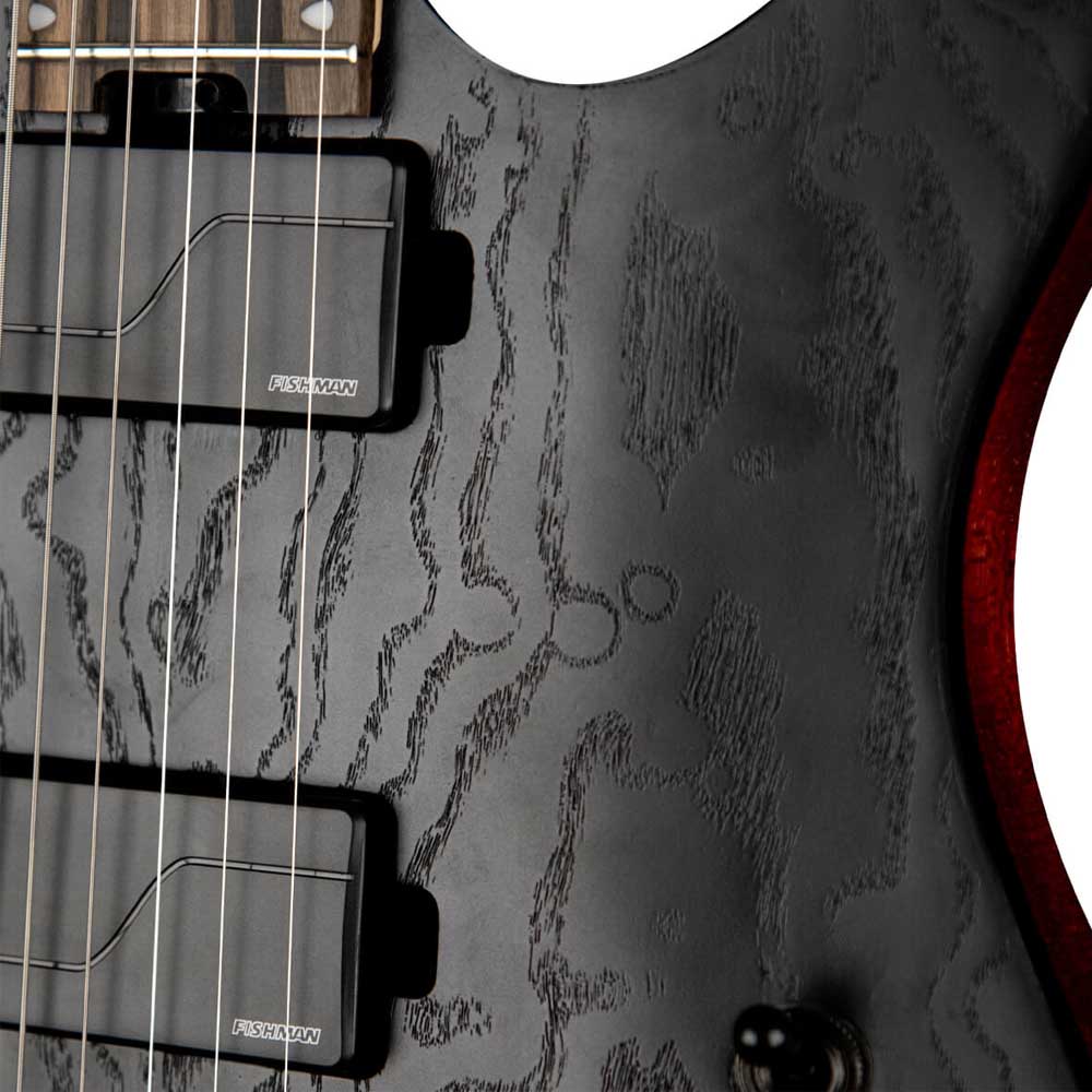 Верхняя дека выполнена из экзотического капа ясеня, установленного на корпус из красного дерева. Такое сочетание формирует уникальный глубокий трёхмерный рисунок с эффектом «травления», делая инструмент визуально эффектным и запоминающимся. По звучанию ясень добавляет искрящиеся обертоны и плотные, пробивные средние частоты, которые идеально дополняют тёплый и насыщенный характер красного дерева, создавая сбалансированный и мощный тон.