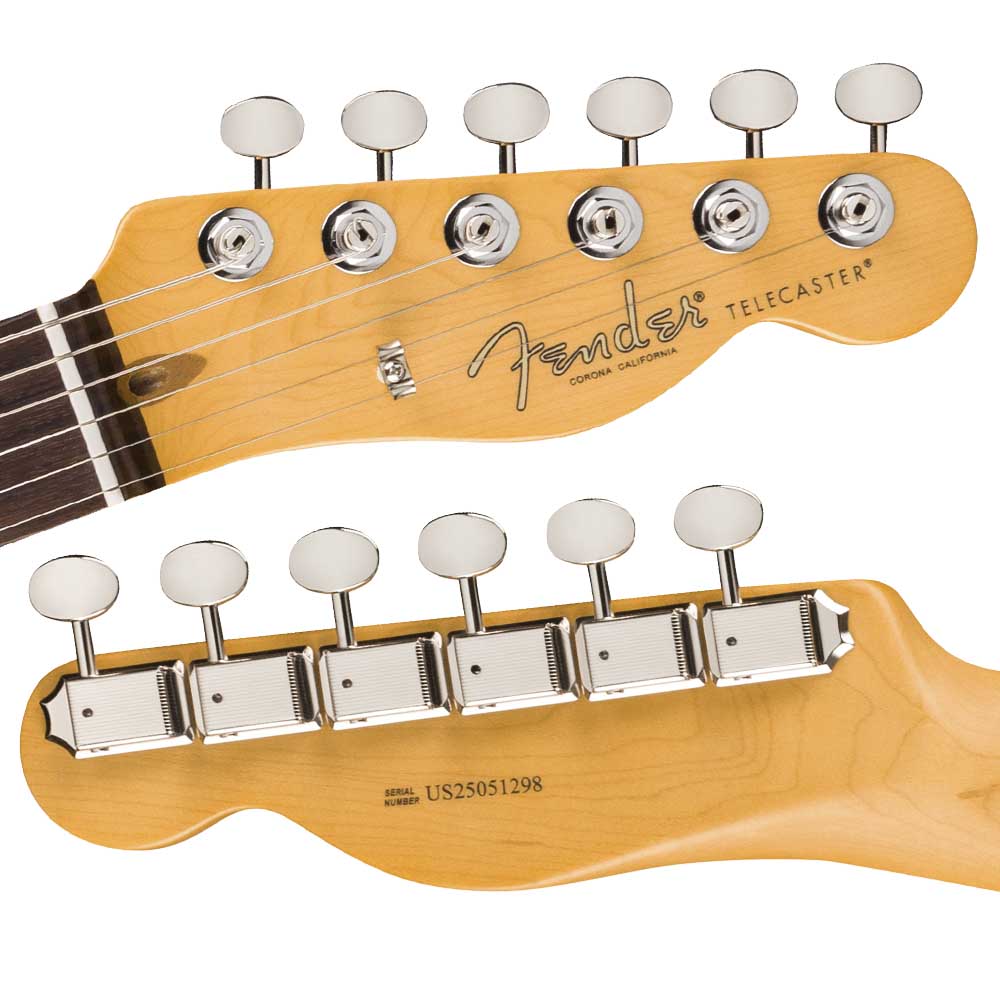 Фурнитура в винтажном стиле подчеркивает классический облик инструмента, а 3-седельный бридж Telecaster® с креплением струн сквозь корпус и латунными седлами с прорезями, обеспечивает правильную интонацию и полную регулировку. Колки Fender Staggered ClassicGear™ сочетают традиционный внешний вид с современной точностью и стабильностью настройки.