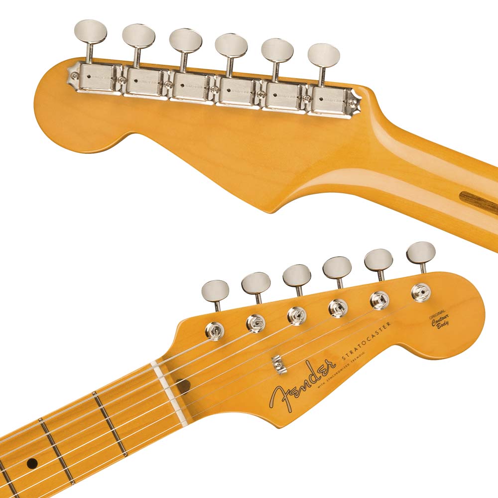 Каждый элемент конструкции этой гитары несёт в себе отпечаток эпохи: от синхронизированного тремоло Pure Vintage с изогнутыми стальными седлами до оригинальных колков Fender Deluxe, которые не только завершают классический облик инструмента, но и обеспечивают стабильность строя и мягкость настройки. Однослойный пикгард подчёркивает винтажный стиль и делает дизайн максимально приближённым к оригиналам 50-х годов.