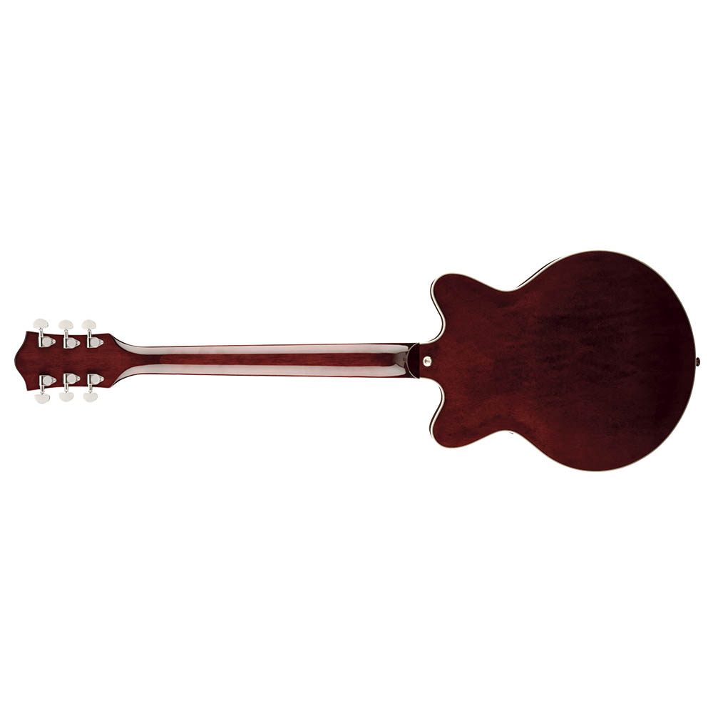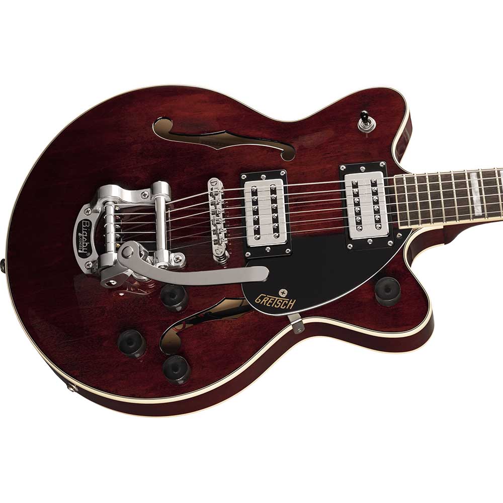 Корпус гитары формы Streamliner Center Block с двумя вырезами выполнен из ламинированного клена. Удобный для быстрой игры гриф профиля Thin "U" изготовлен из древесины нато, с глянцевой отделкой и кремовой окантовкой. Накладка на гриф из выполнен индийского лавра радиусом 12 дюймов (305 мм). Фиксированный бридж Adjusto-matic™ обеспечивает надежность строя, а тремоло Bigsby B50 предоставляет широкие возможности для экспрессивной игры. Инструмент элегантно выглядит в изящном полом корпусе с винтажными черными регуляторами, двухслойной окантовкой корпуса, обтекаемой никелированной фурнитурой и черным пикгардом с логотипом Gretsch.