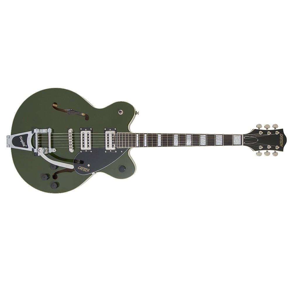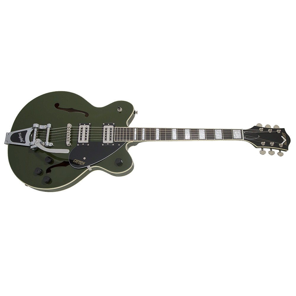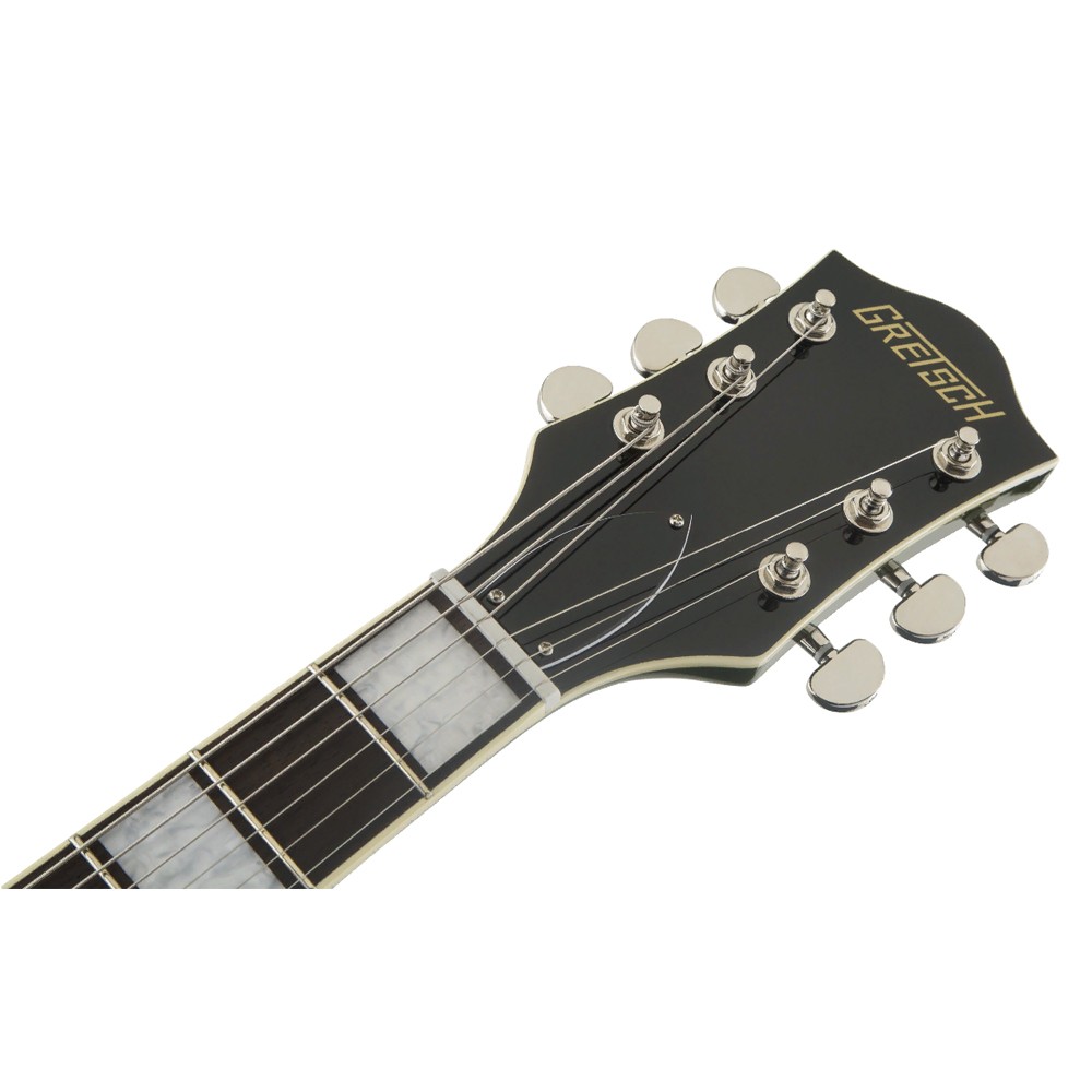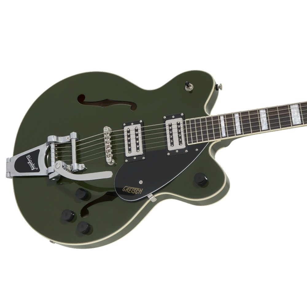 Корпус гитары формы Streamliner Center Block с двумя вырезами выполнен из ламинированного клена. Удобный для быстрой игры гриф профиля Thin "U" изготовлен из древесины нато, с глянцевой отделкой и белой окантовкой. Накладка на гриф из лавра радиусом 12 дюймов (305 мм). Фиксированный бридж Adjusto-matic™ обеспечивает надежность строя, а тремоло Bigsby B70 предоставляет широкие возможности для экспрессивной игры. Инструмент элегантно выглядит в изящном полом корпусе с винтажными золотыми регуляторами, двухслойной черно-белой окантовкой корпуса, обтекаемой никелированной фурнитурой и черным пикгардом с логотипом Gretsch.
