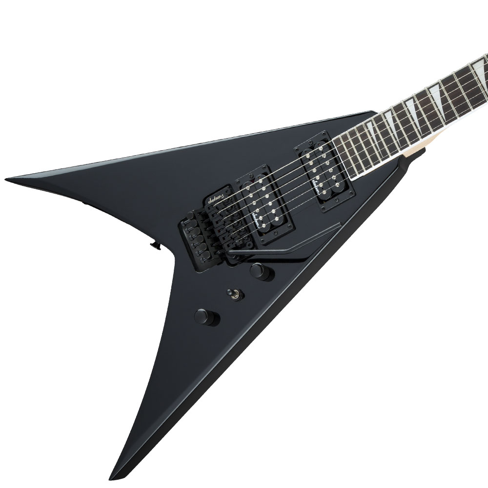 Электрогитара с крутой формой в виде стрелы King V™, корпус из тополя, гриф на болтах из клена с накладкой из амаранта и графитовым армированием, мензура 25.5" (648 мм), 24 лада Jumbo, фурнитура - черный хром, звукосниматели - 2 хамбакера Jackson® High-Output, управление - громкость и тон, бридж с тремоло Floyd Rose® Licensed с двойной блокировкой, литые колки, цвет Gloss Black.