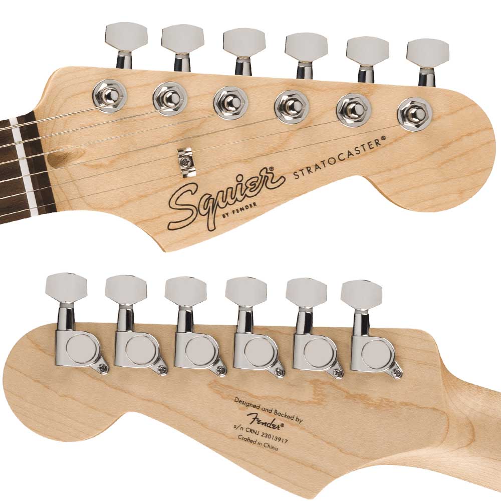 Три керамических звукоснимателя Squier с одной катушкой и 5-позиционным переключателем открывают широкий выбор фирменных тембров Stratocaster — от чистых и прозрачных до насыщенных с лёгким овердрайвом. Эта универсальность позволяет с лёгкостью переходить от блюза и джаза к року и фанк-ритмам, сохраняя характерный "стратовский" почерк.