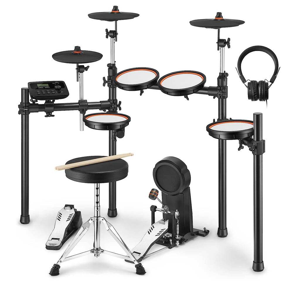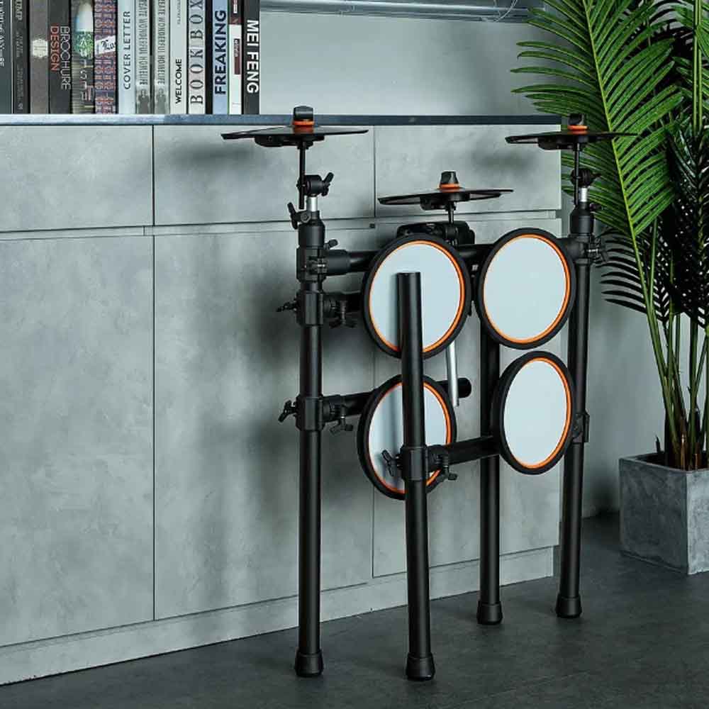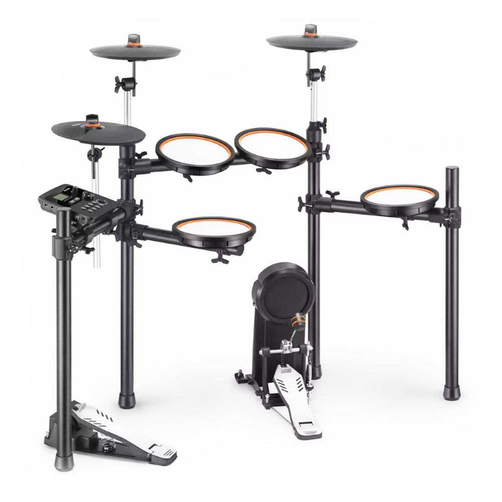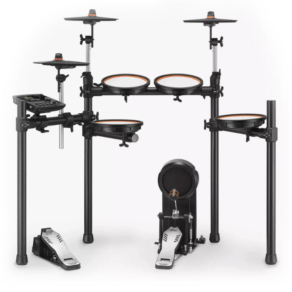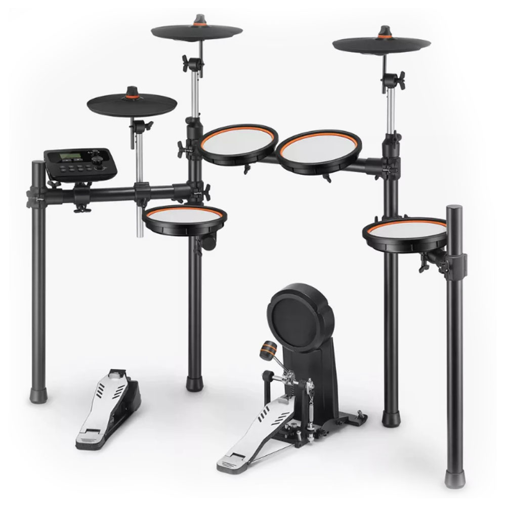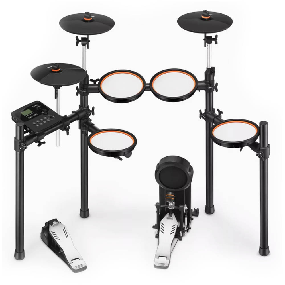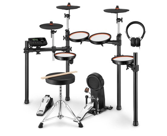 Электронная ударная установка, 5 барабанов, 3 тарелки, сетчатые мембраны пэдов, обновленный модуль с 425 встроенными звуками, 30 предустановленных сэмплов классических ударных установок, динамический отклик сетчатых пэдов, тарелки с точным определением положения, складная конструкция, в комплекте стульчик, барабанные палочки, аудикабель и наушники для бесшумной тренировки.