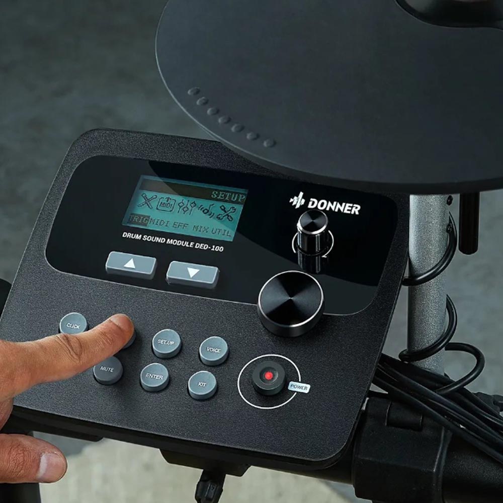 Donner DED-100 - это классная, современная электронная ударная установка, предлагающая превосходное яркое звучание, которое отлично подойдет для тренировок и выступлений! Благодаря своей портативности и складной конструкции DED-100 значительно меньше и легче своих акустических аналогов, что позволяет её легко транспортировать и хранить даже в небольших помещениях. Использование инновационных материалов в производстве этой электронной ударной установки обеспечивает максимальную бесшумность, что делает её идеальной для домашнего использования. На борту цифрового модуля имеется 425 встроенных звуков и 30 классических/современных наборов ударных, благодаря которым вы можете смело экспериментировать со звуком и расширять свои музыкальные границы. Простой и интуитивно понятный интерфейс модуля позволяет легко настроить звук, темп и другие параметры. В нём также имеются функции записи, редактирования и обучения.