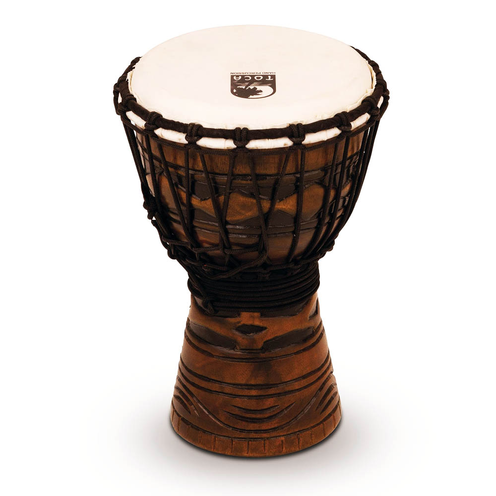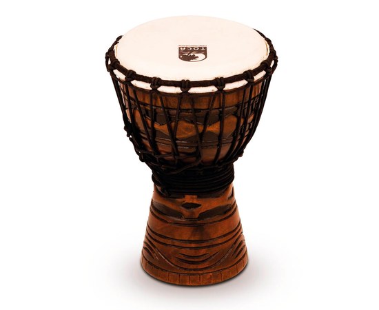 В 2012 году компания Toca выпустила новую серию джембе Origins, среди которых имеется великолепная модель размером 7"х12" TODJ-7AM Origins Series African Mask. Корпус этого барабана вырезан вручную из цельного куска экологически чистого, выращенного на плантации красного дерева, а затем обработан на станке для поддержания равномерной толщины. Внешняя сторона выделяется двумя традиционными дизайнами – классическим мотивом африканской маски и замысловатым рисунком кельтского узла. Интерьер чаши украшен резьбой, которая также прекрасно устраняет ненужные обертона. Края основания также имеют ручную отделку, а мембрана выполнена из тщательно отобранной козьей кожи. В результате такого труда этот великолепный джембе TODJ-7AM воспроизводит одно из лучших звучаний!