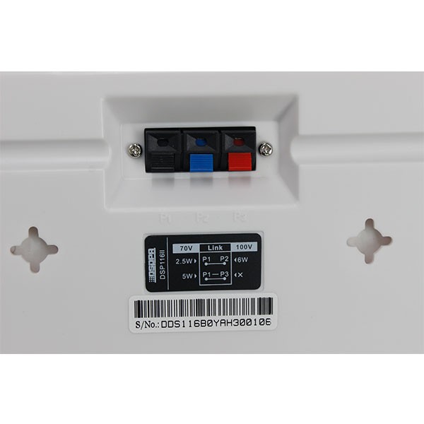DSP116 - это громкоговоритель со встроенным 70/100 вольтовым трансформатором для установки на стены в системах звукового оповещения и музыкальной трансляции. Встроенный трансформатор уменьшает потери в линии на больших расстояниях и позволяет легко подключать много громкоговорителей в параллельной схеме подключения, кроме этого громкоговоритель может быть подключен к низкоомному усилителю.Громкоговоритель имеетэффективный частотный диапазон от 180Гц и до 15 кГц. Вариация мощности 2,5-5 Вт (70В) и 6 Вт (100В), позволяют использовать громкоговоритель в помещениях небольшого размера. Корпус громкоговорителя изготовлен из высококачественного конструктивного пластика, что обеспечивает долговечность эксплуатации.Идеально подходит для коммерческого использования в системах фоновой музыки для ресторанов, отелей, школ и магазинов.
