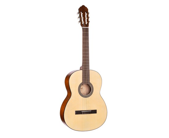Классическая гитара, верхняя дека из ели, нижняя дека и обечайка из красного дерева, гриф из красного дерева, накладка на гриф из палисандра, мензура 25.6" (650 мм), бридж из палисандра, струны Savarez, натуральный полуглянцевый цвет.