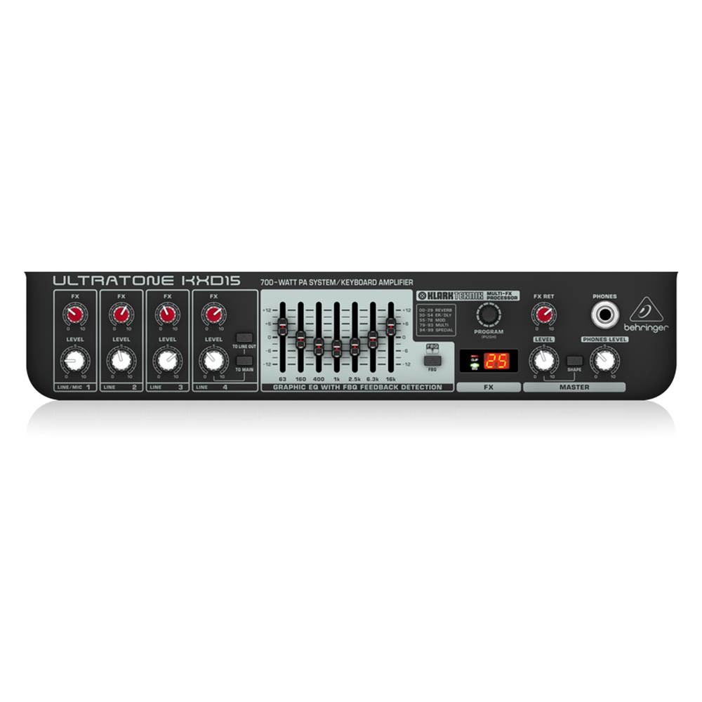 Универсальность, невероятный звук и долговечность - основные качества этого легкого, мощного усилителя прекрасно подходящего для подзвучивания клавиш, электронных ударных и микрофонов. Вооруженный мощным усилителем мощности 700 Вт, концертным 12-дюймовым динамиком TURBOSOUND, студийным процессором KLARK TEKNIK Multi-FX и 7-полосным графическим эквалайзером FBQ, ULTRATONE KXD12 поможет полностью реализовать ваш потенциал.