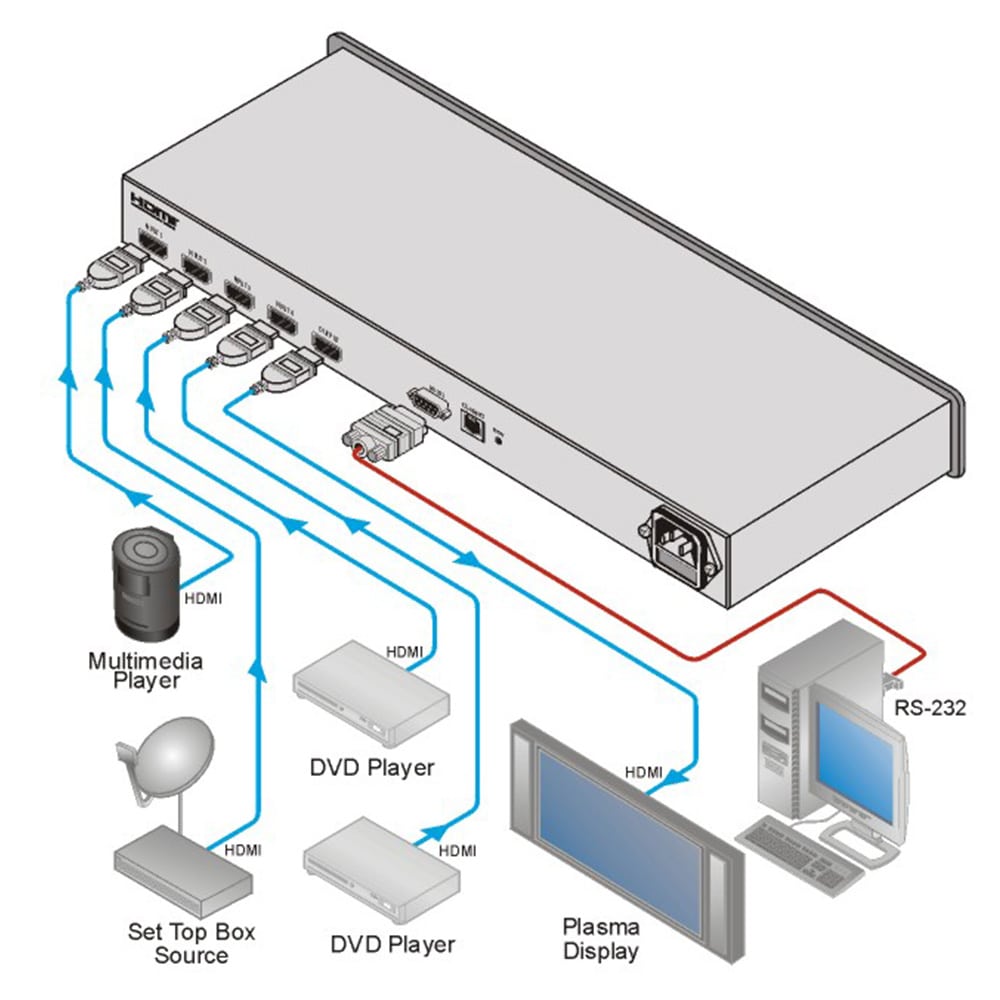VS-41H - высококачественный коммутатор 4x1 для сигналов HDMI. Он компенсирует АЧХ кабеля и выполняет перетактирование сигнала с выбранного входа, после чего выдает его на единственный выход.