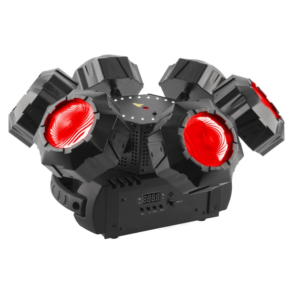 - Многофункциональный световой прибор для создания ярких световых эффектов, включающие в себя управляемые RGBW лучи, круглые SMD стробы, красные и зеленые лазерные лучи на базе с непрерывным вращением по панорамированию