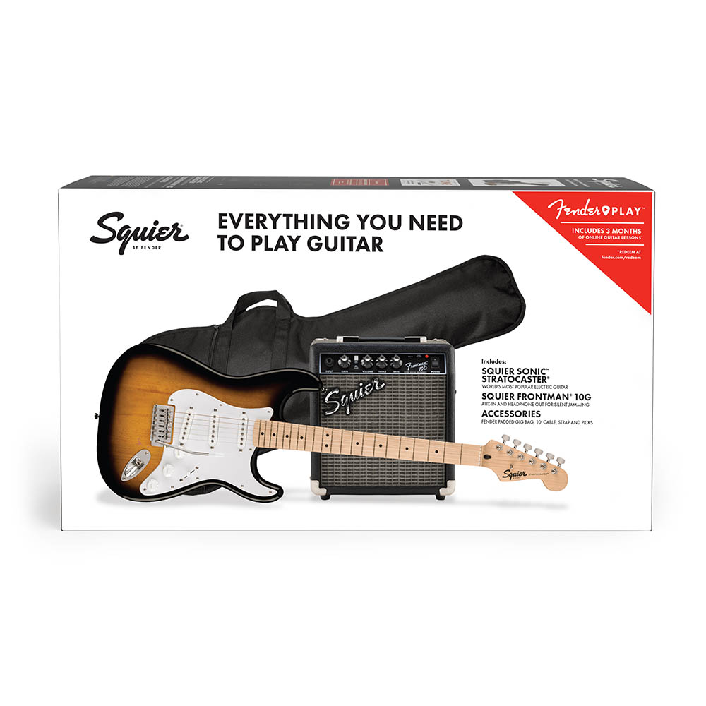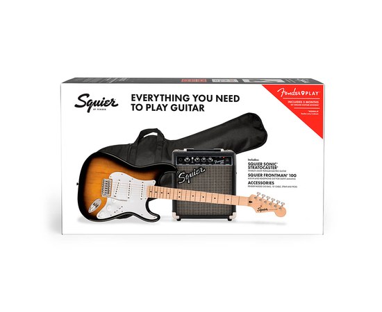 Это классный набор для начинающих гитаристов, включающий в себя электрогитару Squier Sonic™ Stratocaster® SSS, мягкий чехол с подкладкой для гитары, комбоусилитель Frontman 10G и все необходимые аксессуары для того, чтобы начинать играть: инструментальный кабель для подключения, ремень для гитары и медиаторы.