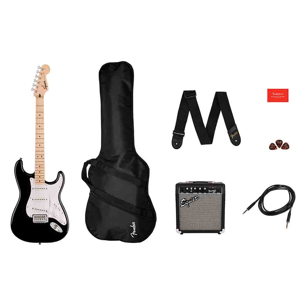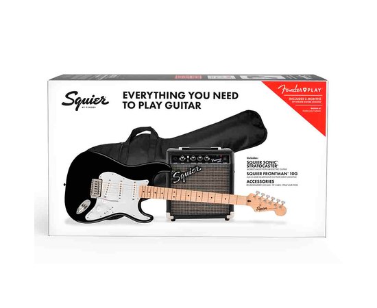 Это классный набор для начинающих гитаристов, включающий в себя электрогитару Squier Sonic™ Stratocaster® SSS, мягкий чехол с подкладкой для гитары, комбоусилитель Frontman 10G и все необходимые аксессуары для того, чтобы начинать играть: инструментальный кабель для подключения, ремень для гитары и медиаторы.