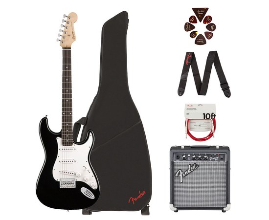 Squier Stratocaster SSS Pack - это набор для начинающих гитаристов, включающий в себя электрогитару Squier Stratocaster SSS, мягкий чехол с подкладкой для гитары, комбоусилитель Frontman 10G и все необходимые аксессуары для того, чтобы начинать играть: инструментальный кабель для подключения, ремень для гитары и медиаторы.