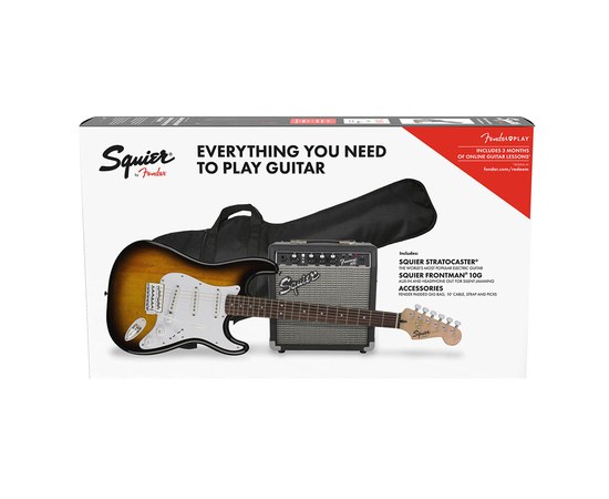 Гитарный набор, подходит для начинающих гитаристов. В наборе: электрогитара Squier Stratocaster SSS, комбоусилитель Fender Frontman мощностью 10 Вт, ремень, мягкий чехол, кабель, медиаторы, подписка на Fender Play на 3 месяца.
