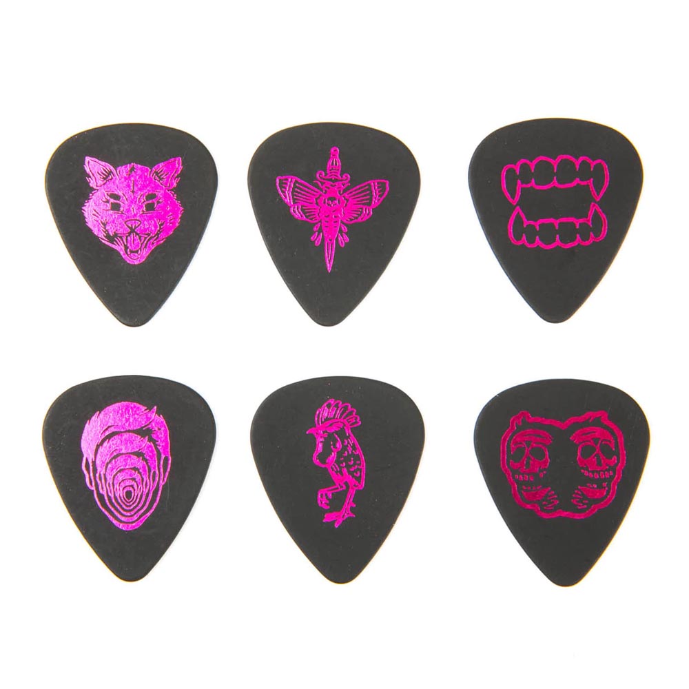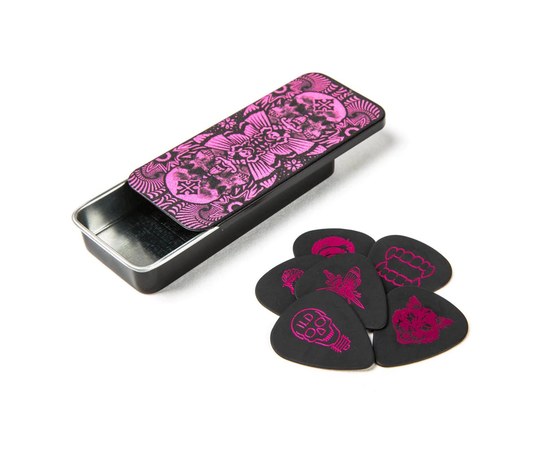 Набор медиаторов с дизайном ILOVEDUST, из подлинного материала Tortex, толщина 0.88 мм, 6 штук в комплекте, набор поставляется в стильной металлической коробочке, подоходят для профессиональных гитаристов, производство США.