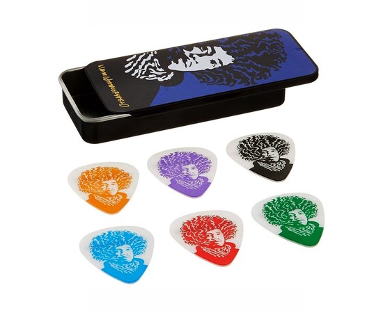 Набор медиаторов с рисунками Джона Ван Хамерсвелда, толщина 0.73 мм (Medium), 6 штук в комплекте, жесткие, набор поставляется в стильной металлической коробочке, производство США.