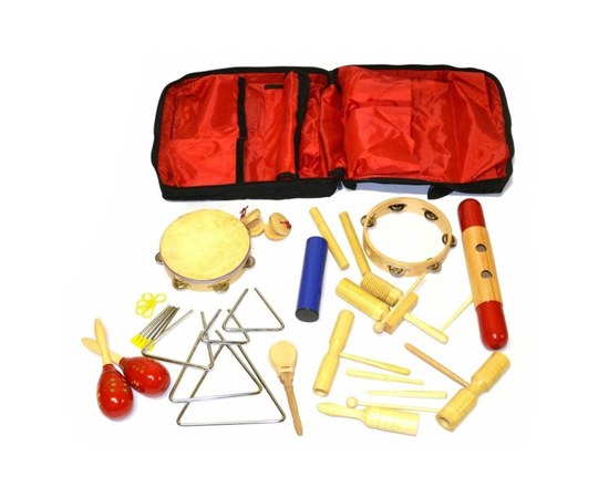 Набор перкуссии из 17 предметов в чехле-сумке: маракасы на ручке деревянные, кастаньеты на ручке, треугольники 5 штук, тамбурин, кастаньеты, шейкер металлический, бубен, гуиро, агого, тон-блок, двойной тон-блок.