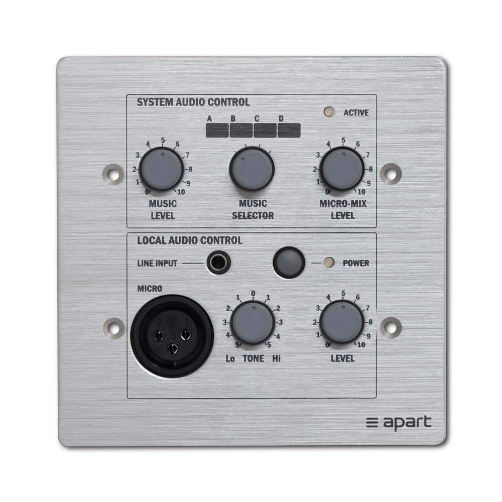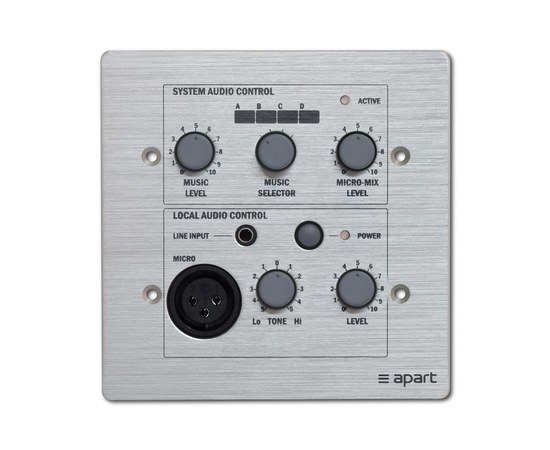 APart PM1122RL - это проводная панель управления для предусилителя PM1122, которая дает возможность регулировать громкость микрофонов, громкость фоновой музыки и выбирать источник фоновой музыки. APart PM1122RL предоставляет возможность подключения локального микрофона к разъему XLR и/или источника линейного аудио сигнала к разъему mini Jack на передней панели. К разъему mini Jack также возможно подключить источники аудио сигнала с выходом для наушников, такие как IPod, портативный MP3 проигрыватель или компьютер. Фантомное питание локального микрофона включается при помощи перемычки с обратной стороны панели управления. Винты для крепления панели к монтажной коробке поставляются в комплекте. Панель подключается к предусилителю при помощи стандартного кабеля CAT5 прямой разводки (компьютер - хаб), длиной до 300 метров. Одновременно может быть подключена только одна панель APart PM1122RL к каждой зоне предусилителя PM1122.