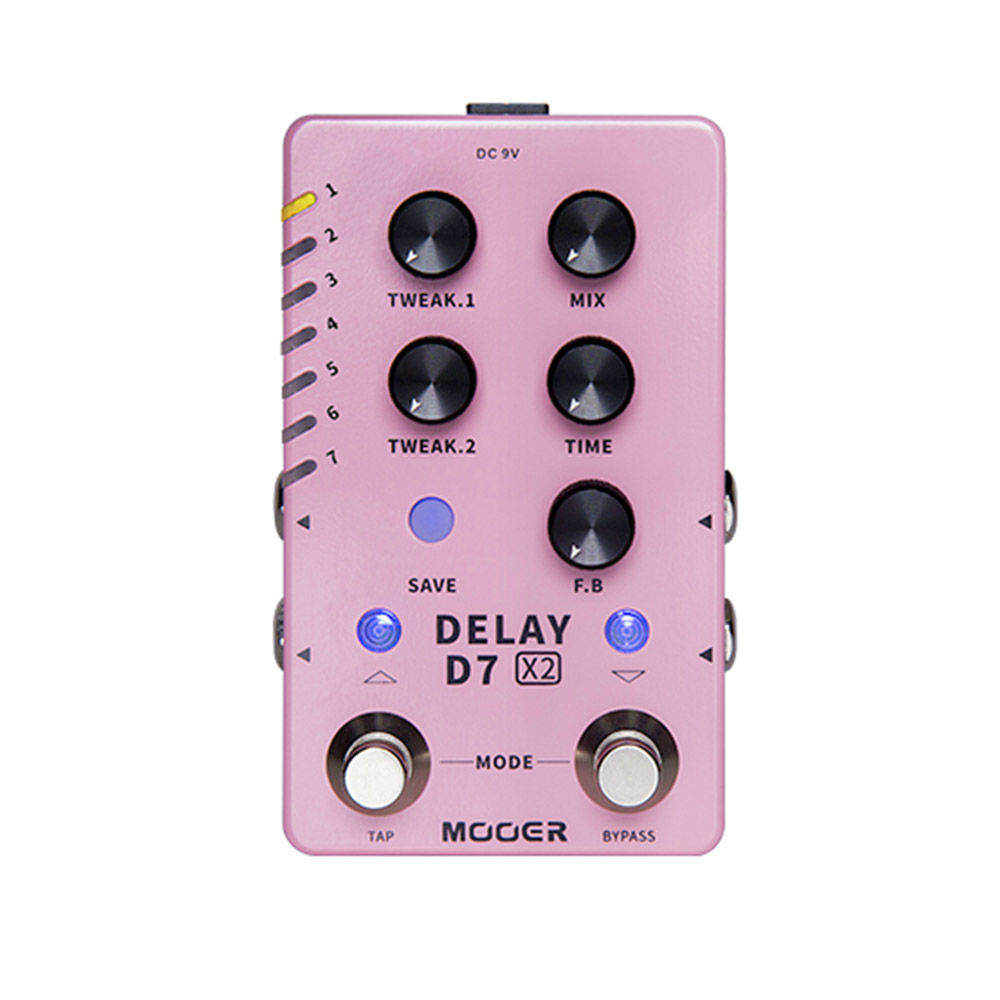 Педаль задержки D7 X2 имеет широкий диапазон от классических аналоговых и ленточных задержек до более современных и экспериментальных задержек, таких как «Low-Bit», «Galaxy» и «PingPong». Настраиваемые параметры различаются в зависимости от каждого эффекта и могут быть настроены с помощью ручек Tweak 1 и Tweak 2. Дополнительные параметры можно настроить с помощью ручек MIX, TIME и FEEDBACK. Время каждой задержки можно отрегулировать с помощью ручки TIME или с помощью ножного переключателя TAP TEMPO для быстрой настройки на лету.