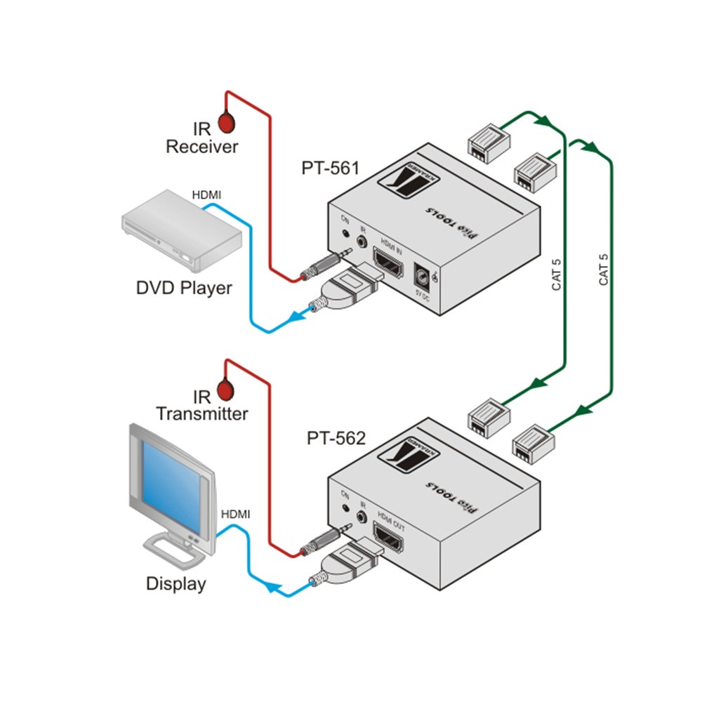 Kramer PT-561 и PT-562 — пара из передатчика и приемника сигнала HDMI и ИК по кабелю на витой паре. PT-561 преобразует сигнал HDMI и ИК в формат, пригодный для передачи по витой паре и передает его на PT-562, который выполняет обратное преобразование сигнала из формата пригодного для передачи по витой паре в сигналы HDMI и ИК.