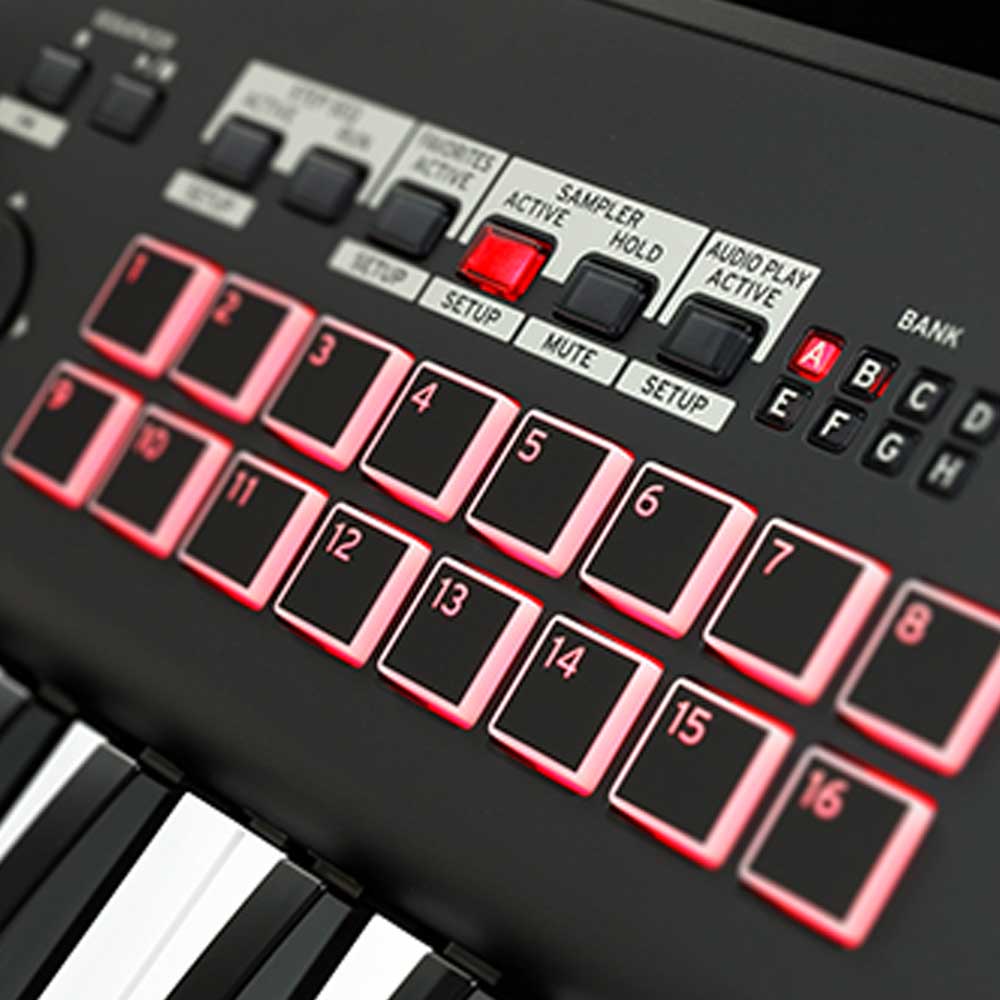 Как первый в своем классе, KROSS 2 оснащен уникальной функцией семплирования, которая обеспечивает 16 воспроизводимых пэдов. Вы можете записать ввод с разъема LINE IN и назначить стереофонический сэмпл продолжительностью до 14 секунд на каждый пэд. Одновременно можно активировать до четырех пэдов. Вы можете редактировать семпловую форму сигнала, используя такие функции, как установка начальной/конечной точки цикла, а также нормализацию и даже ресэмплирование в KROSS 2, что позволяет Вам выполнять обширный сэмплирование без использования какого-либо дополнительного оборудования. На эти пэды также можно назначать длинные аудиофайлы с SD-карты.