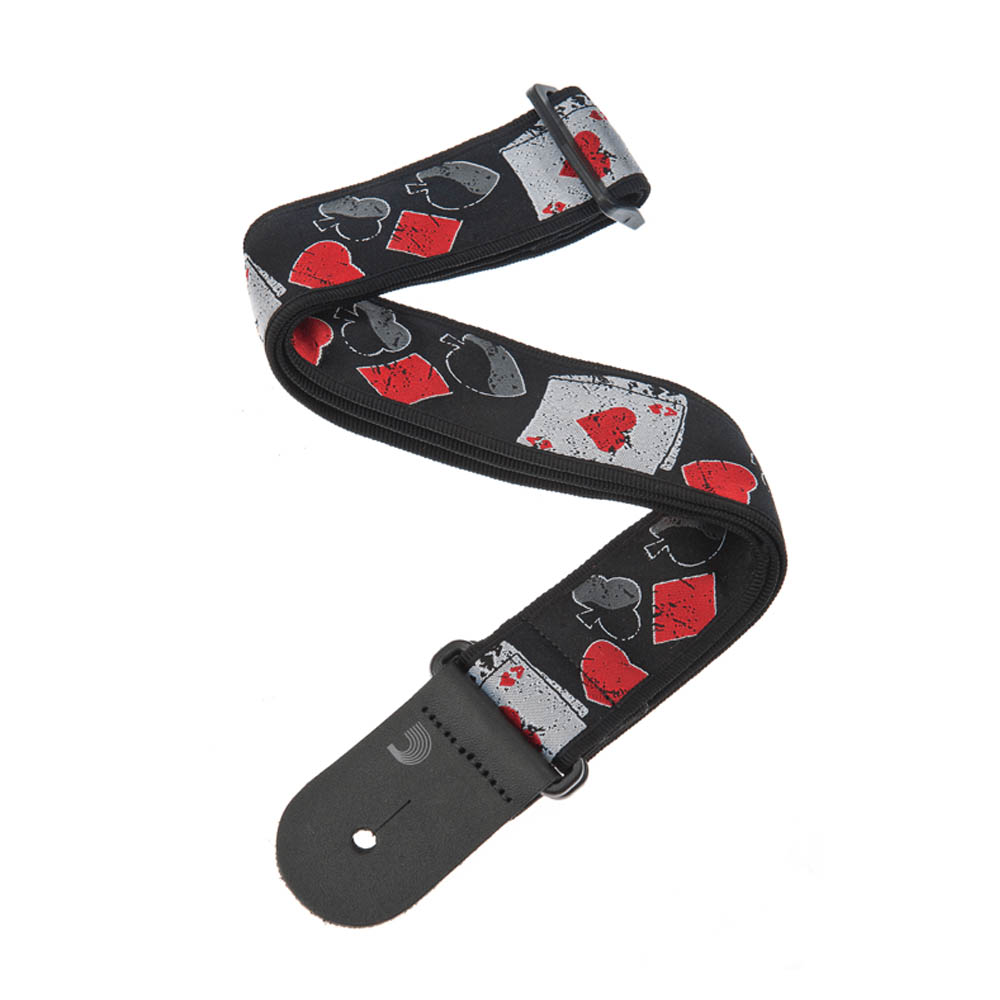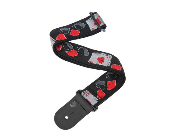 Высококачественный ремень для гитары, дизайн с изображением игральных карт, выполнен из эластичного нейлона, крепкие наконечники из натуральной кожи, обеспечивает надежную стабильность и безопасность удержания гитары, регулируемая длина от 35" (88,9 см.) до 59,5" (151,1 см).