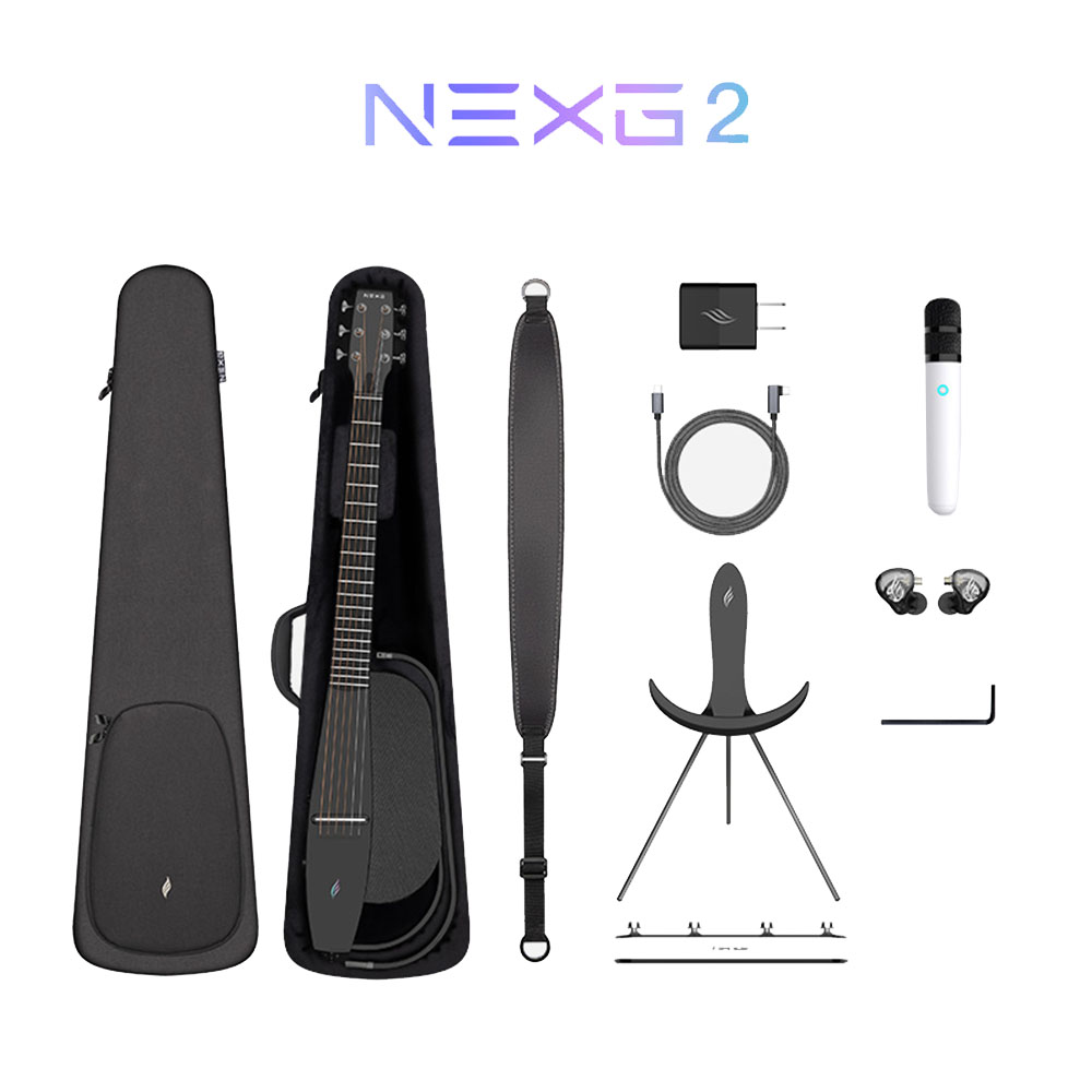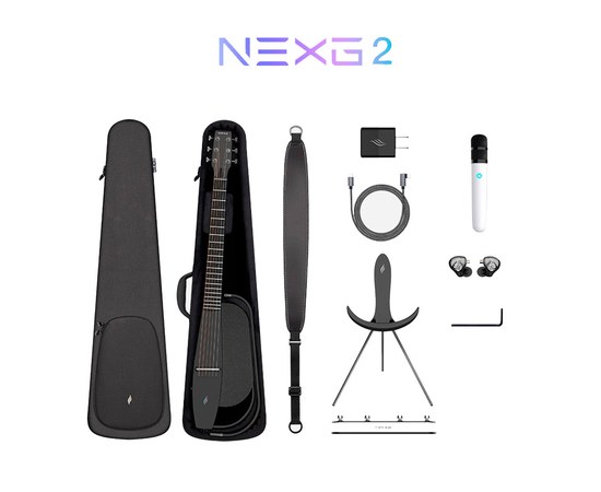 Интеллектуальная гитара NEXG2, сверхпрочный чехол, подставка с беспроводной зарядкой, беспроводная педаль, портативный беспроводной микрофон, беспроводные профессиональные мониторные наушники концертного уровня, адаптер для быстрой зарядки 30 Вт, кабель для зарядки/внутренней записи OTG/обновления данных, фирменный ремень, регулировочный ключ.
