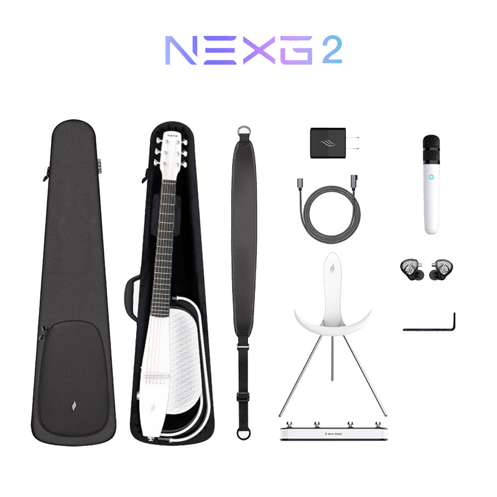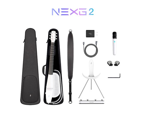 Интеллектуальная гитара NEXG2, сверхпрочный чехол, подставка с беспроводной зарядкой, беспроводная педаль, портативный беспроводной микрофон, беспроводные профессиональные мониторные наушники концертного уровня, адаптер для быстрой зарядки 30 Вт, кабель для зарядки/внутренней записи OTG/обновления данных, фирменный ремень, регулировочный ключ.