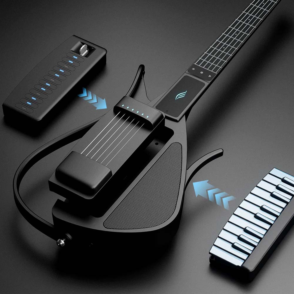 Модуль оснащён силиконовыми струнами с нулевым ходом, которые значительно снижают нагрузку на пальцы. Такая конструкция делает захват аккордов лёгким и быстрым, позволяя обучаться без привычного периода адаптации, который обычно требуется при игре на традиционной гитаре. Это решение особенно удобно для начинающих, а также для тех, кто хочет тренироваться дольше и комфортнее.