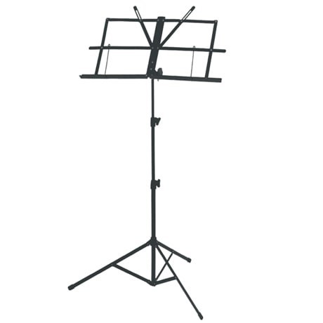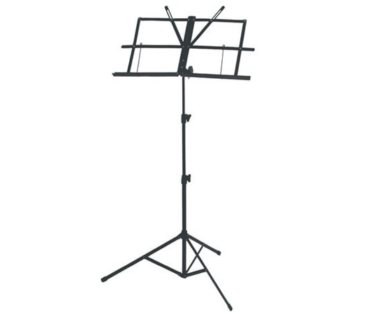 Складной пюпитр, регулируемая высота в диапазоне от 640 и до 1270 мм, размер нотного планшета 505 на 290 мм, выполнен из стали и окрашен в черный цвет.