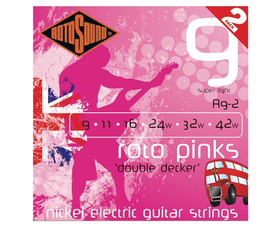 Rotosound R9-2 - это стальные никелированные “Double Decker” (двухъярусные) струны для электрогитары, которые подойдут как новичкам гитаристам, так и профессионалам. Струны имееют гладкий мощный тон, а благодаря никелю отражающему магнитные колебания, создают объемный и яркий звук. Для производства струн Rotosound использует только качественные никель и сталь, чтобы гарантировать комфорт, надёжность и отличные звуковые качества. Струны от Rotosound используются многими известными гитаристами, например такими как Гутри Гован и Франц Фердинанд, также в ряды пользователей входят: Billy Sheehan, Alex Lofoco, Geddy Lee, Ian Parker, Jaco Pastorius, Oasis, Pink Floyd, Steve Hooker и другие. Двойные комплекты струн маркируются R9-2 и R10-2 и уменьшают размер упаковки приблизительно на 70 % по сравнению с двумя одиночными.